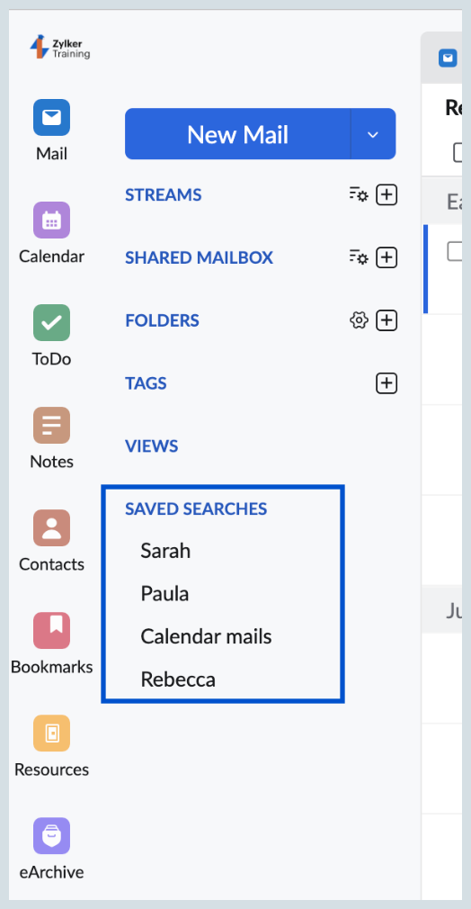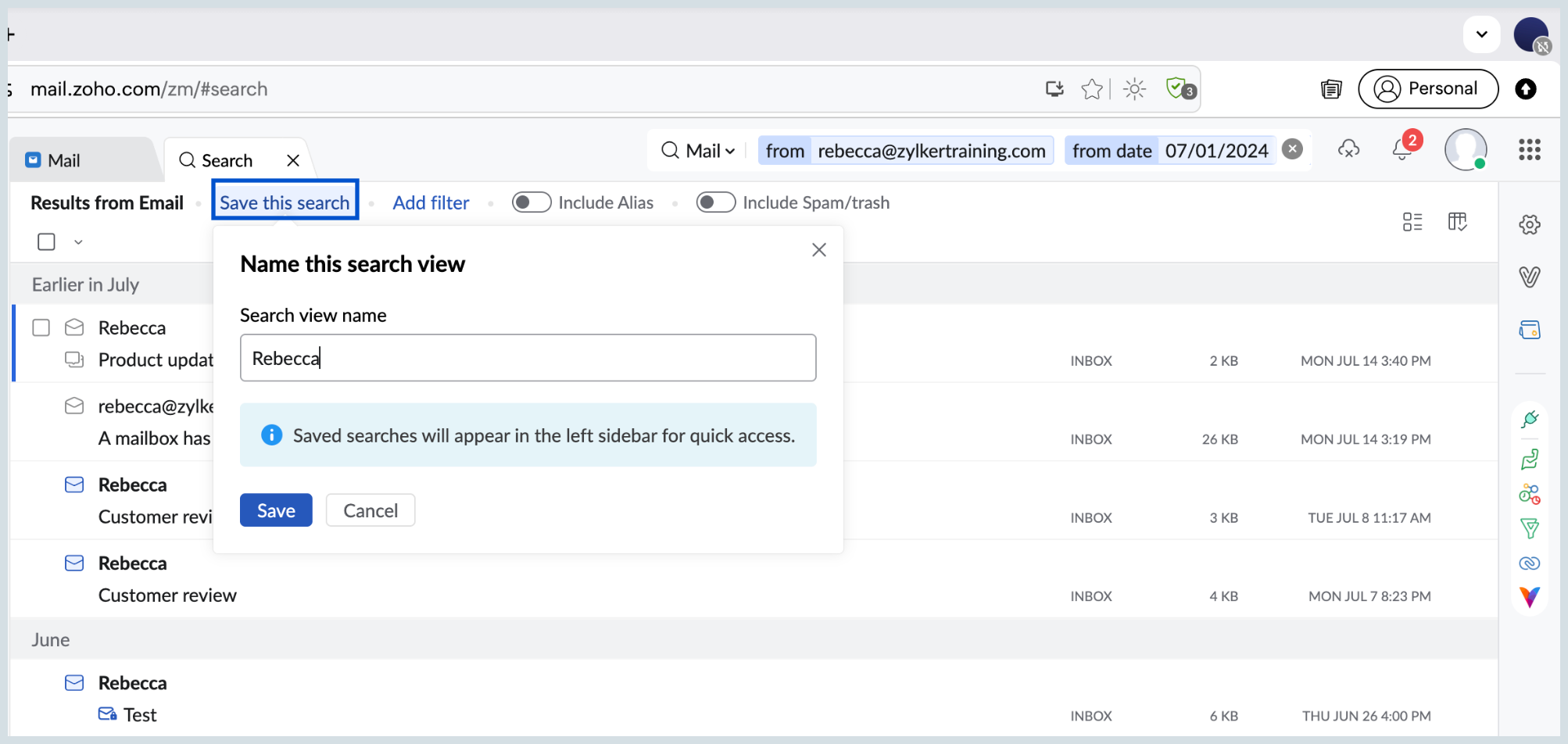 Zoho Mail provides you with an option to save such 'Searches' for future use using the