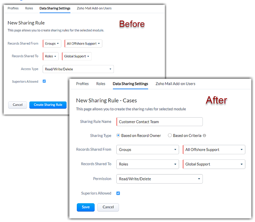 This is where the new criteria for rule sharing enters the picture. With this enhancement, you can create sharing rules based on specific criteria, giving you greater flexibility to set up rules to share the exact records required, either based on criteria or based on record owner, with other roles or groups within your CRM. This is more automated, more accurate, and saves time.
