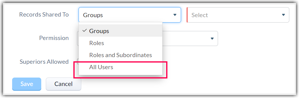 • Records Shared To: Besides sharing records with Roles, Groups, or Roles and Subordinates, records can now also be shared with All Users