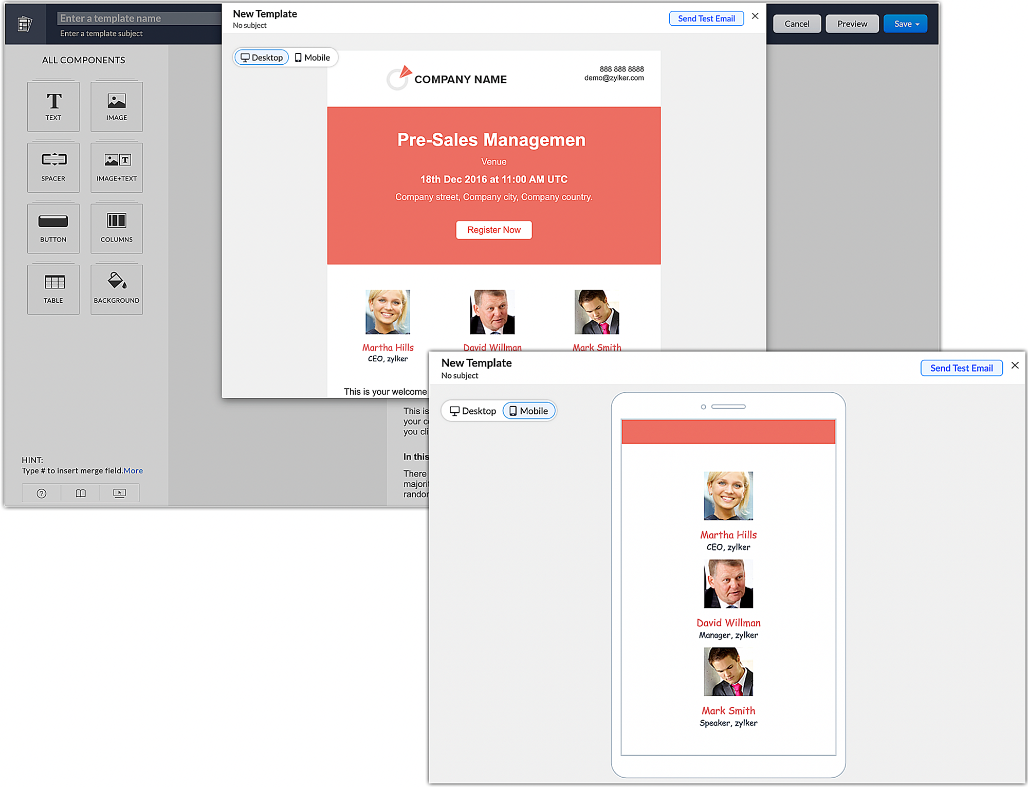 For existing templates, the responsive feature will be effective once you edit and save them again. In line with the responsive template, we have introduced two new options for template preview—Mobile and Desktop, to quickly check the responsive functionality of your emails.