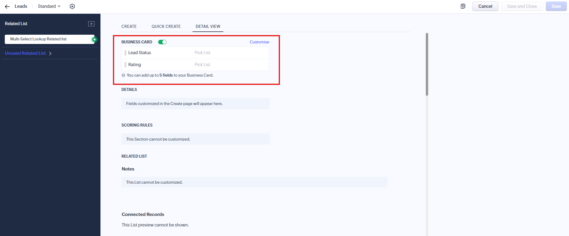 Example of Business Card customisation in CRM: