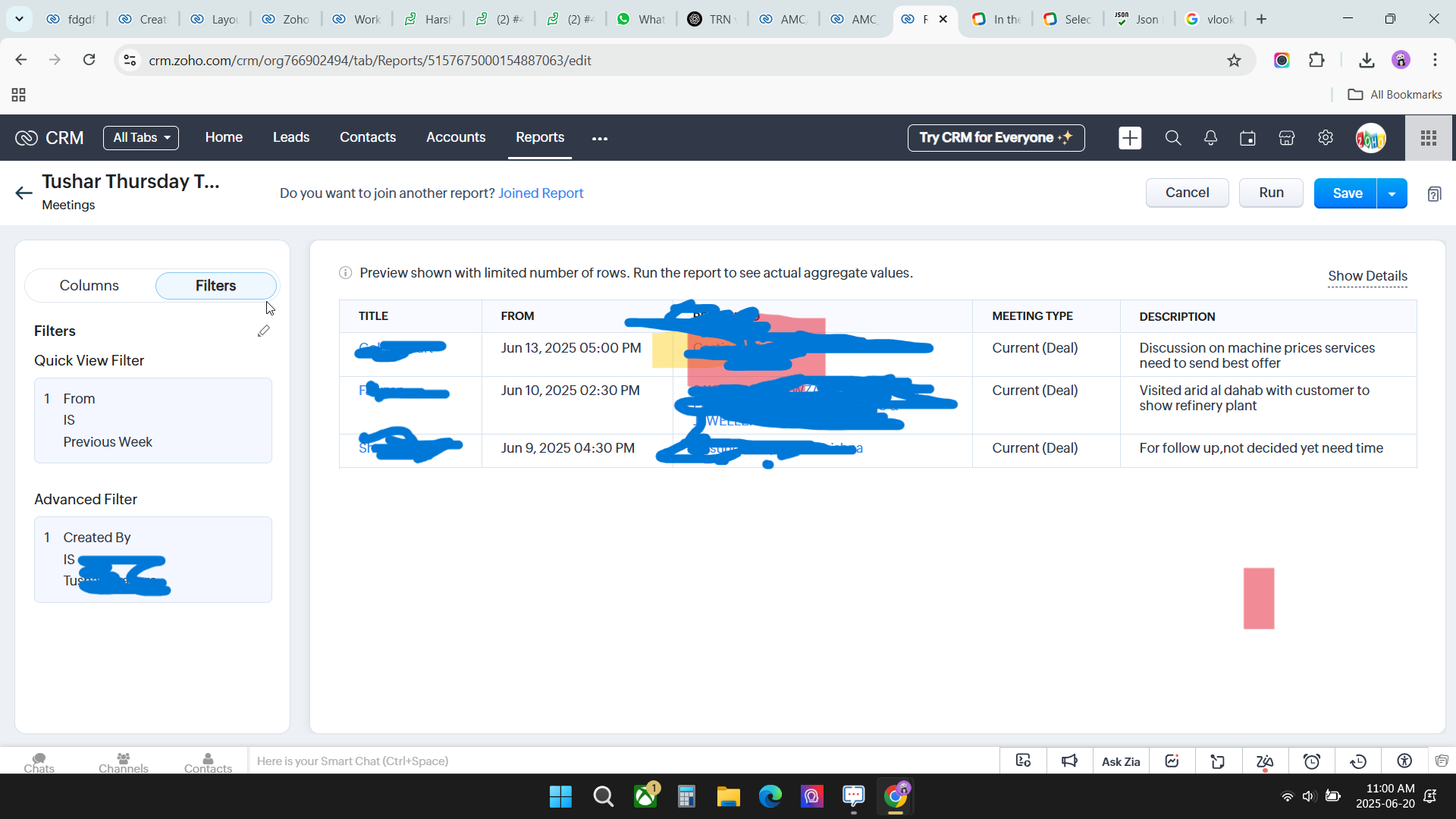 I wan to schedule a meeting report From previous Thursday to this thursday of this week on Every 6 pm want to recive this report in zoho CRM