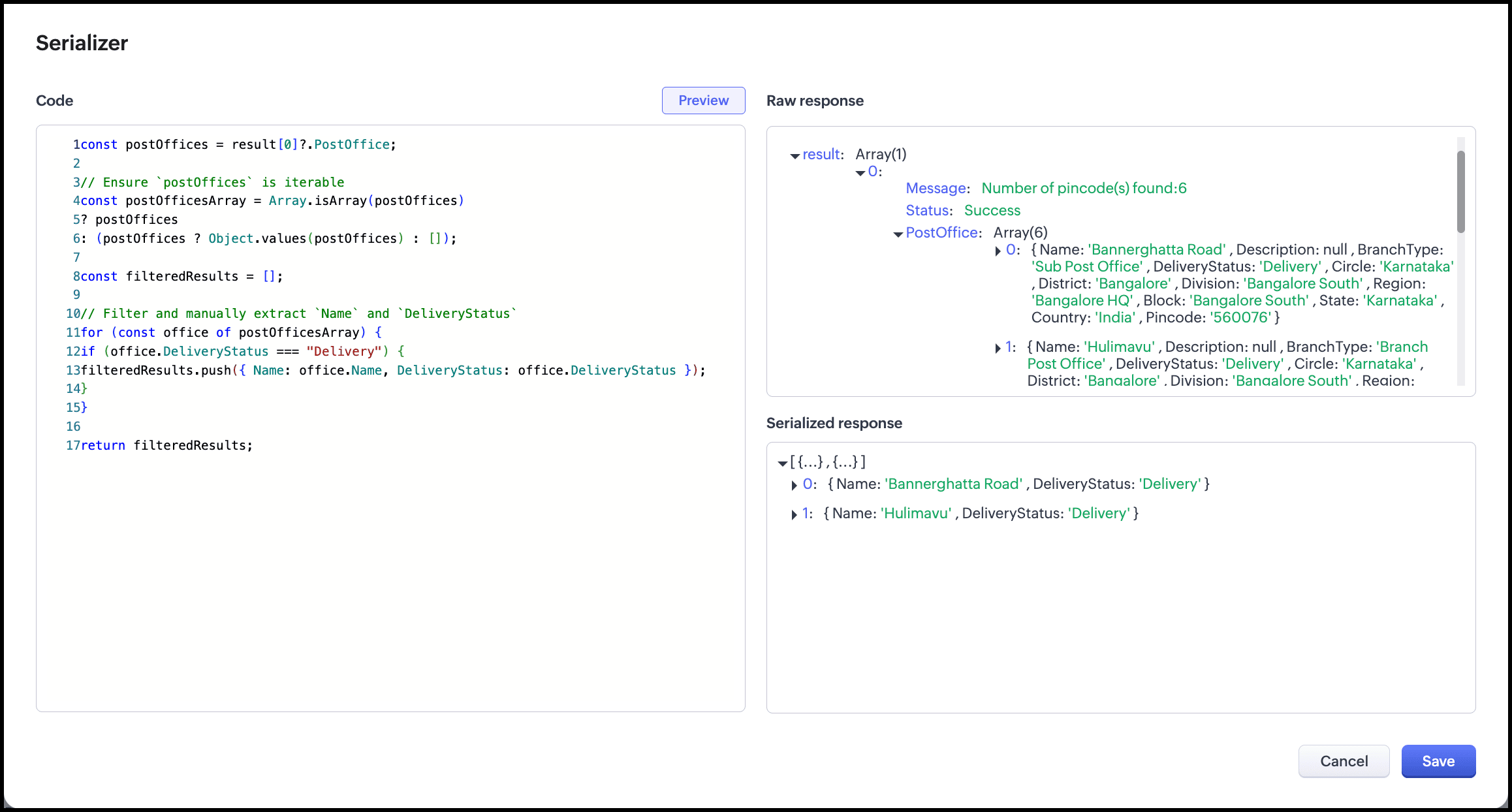 You can see that the query fetches all the post offices in that PIN code and the serializer displays only those with the delivery status 'Delivery'.