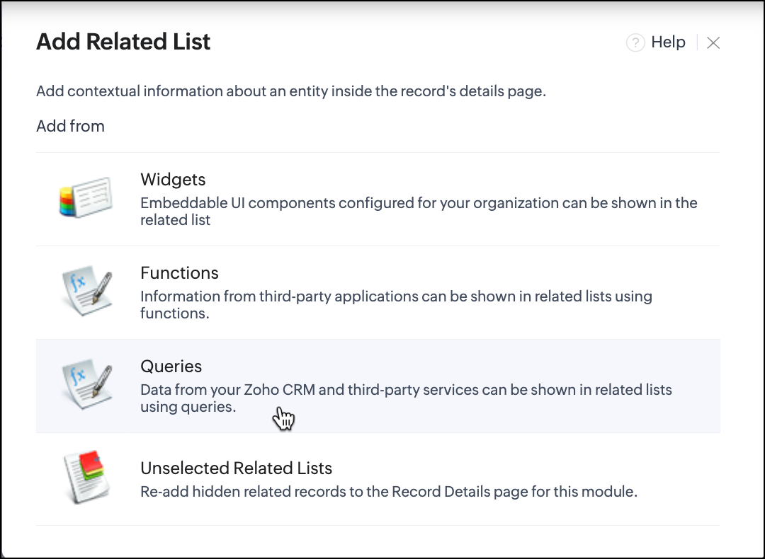 We’re now taking that power to the next level. You can now create related lists that are powered by Queries, meaning they can dynamically fetch data from other modules, external services, or custom integrations, at runtime!