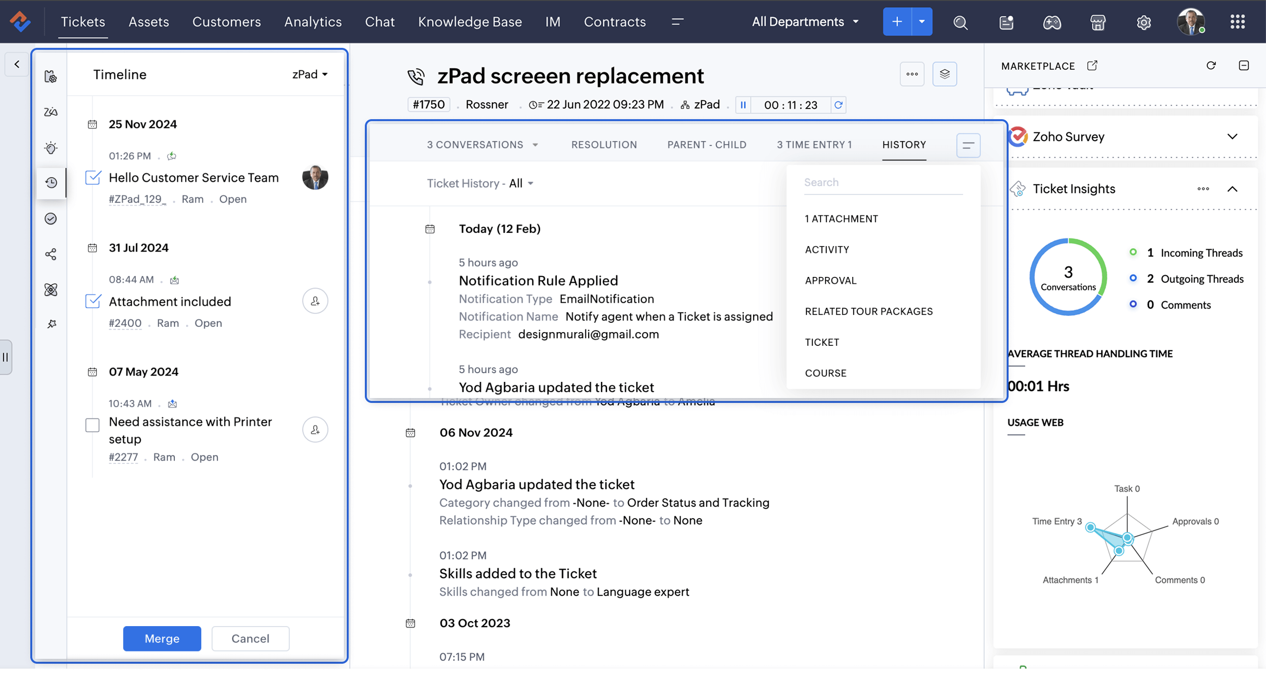 • The Ticket Timeline let them keep an eye on the previous cases handled for the client in the specific Department or All Department. Within a specific department, agents could also merge tickets for efficient handling.