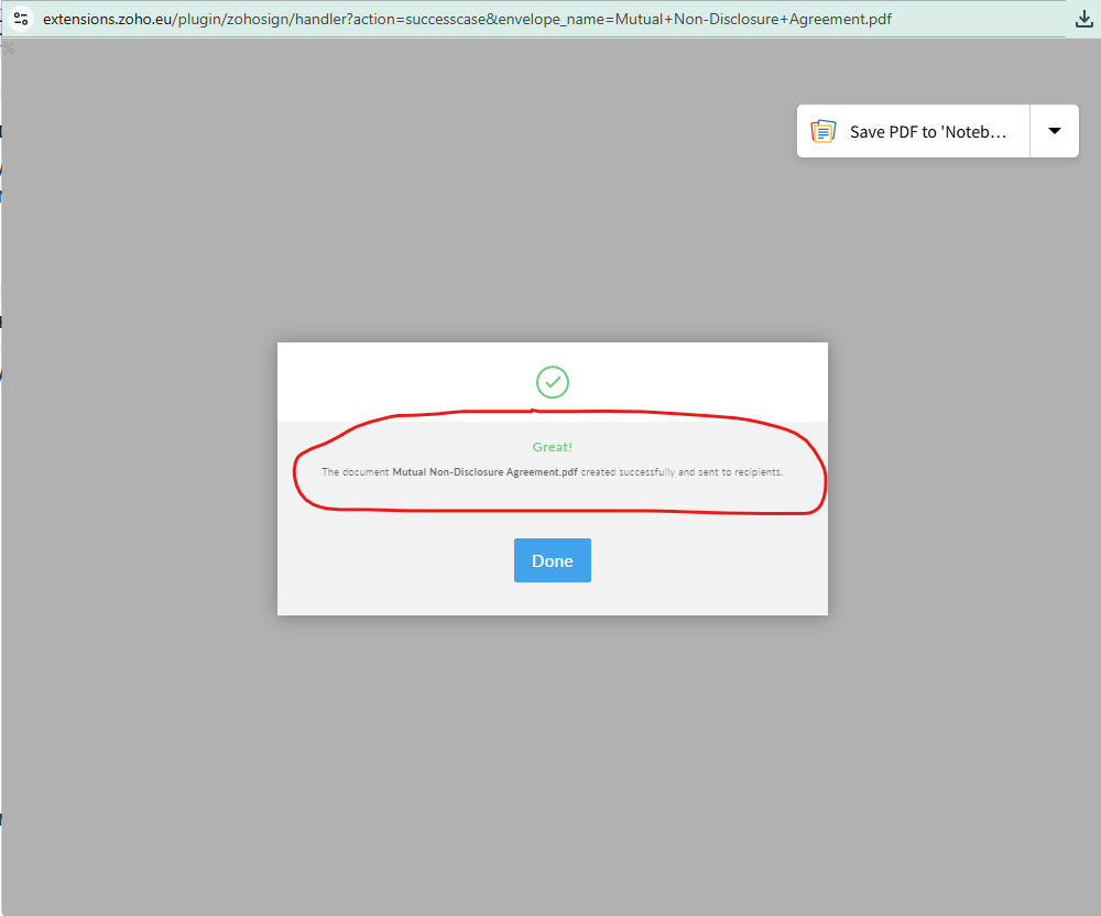 This message is visible when creating a Zoho Sign document through Zoho CRM.