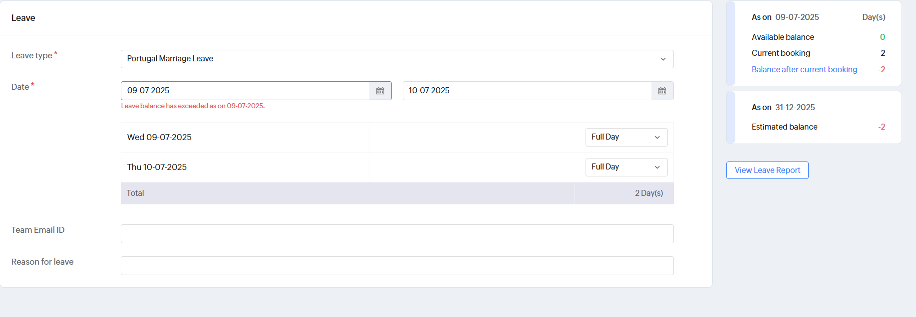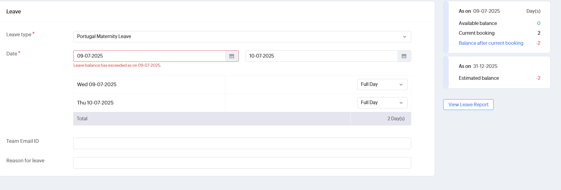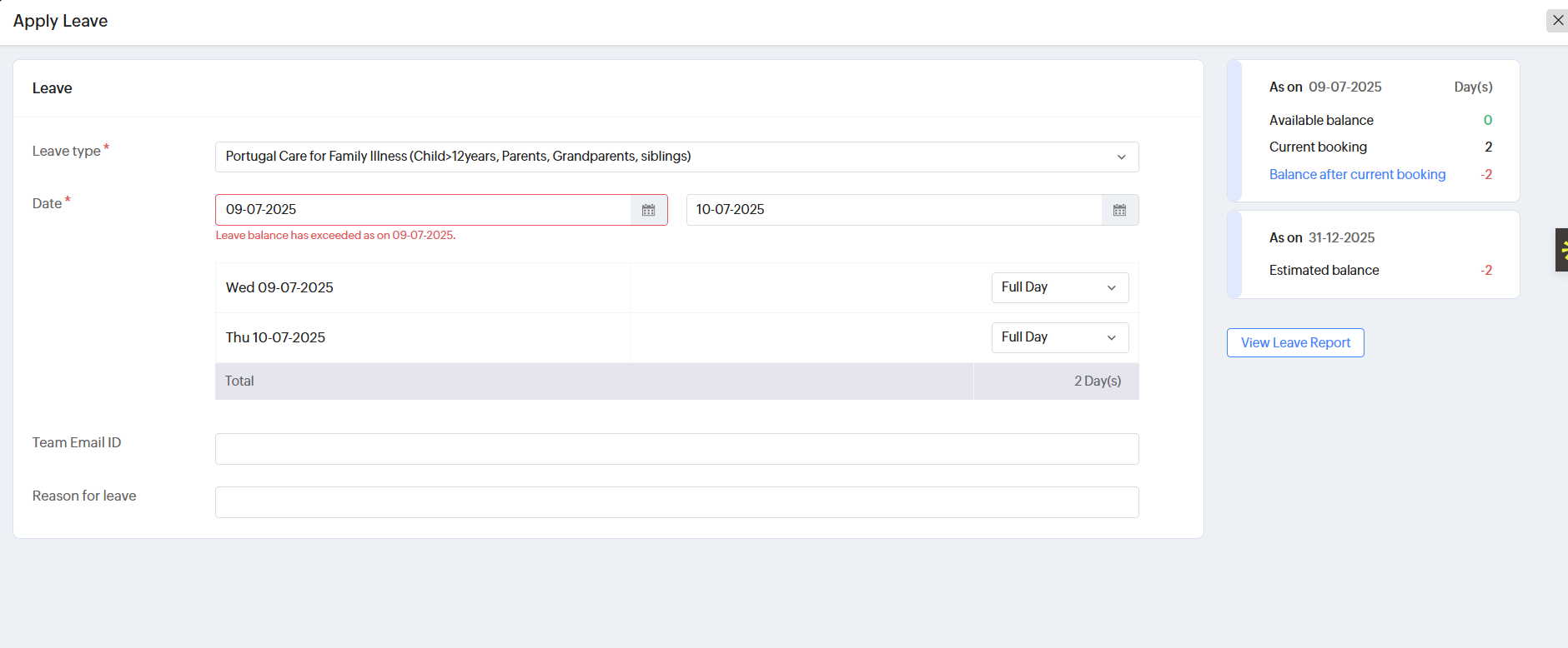Zoho People Leave Application Module Error: Leave balance has exceeded as on 09-07-2025.