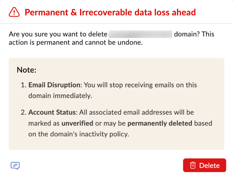Zohoアカウントからドメインを削除する際、確認画面で削除操作を確定すると、該当のドメインに関連付けられているメールアドレスとサブドメインはすべて未認証として設定されます。以下の画像は、ドメインの削除の確認画面の例です。