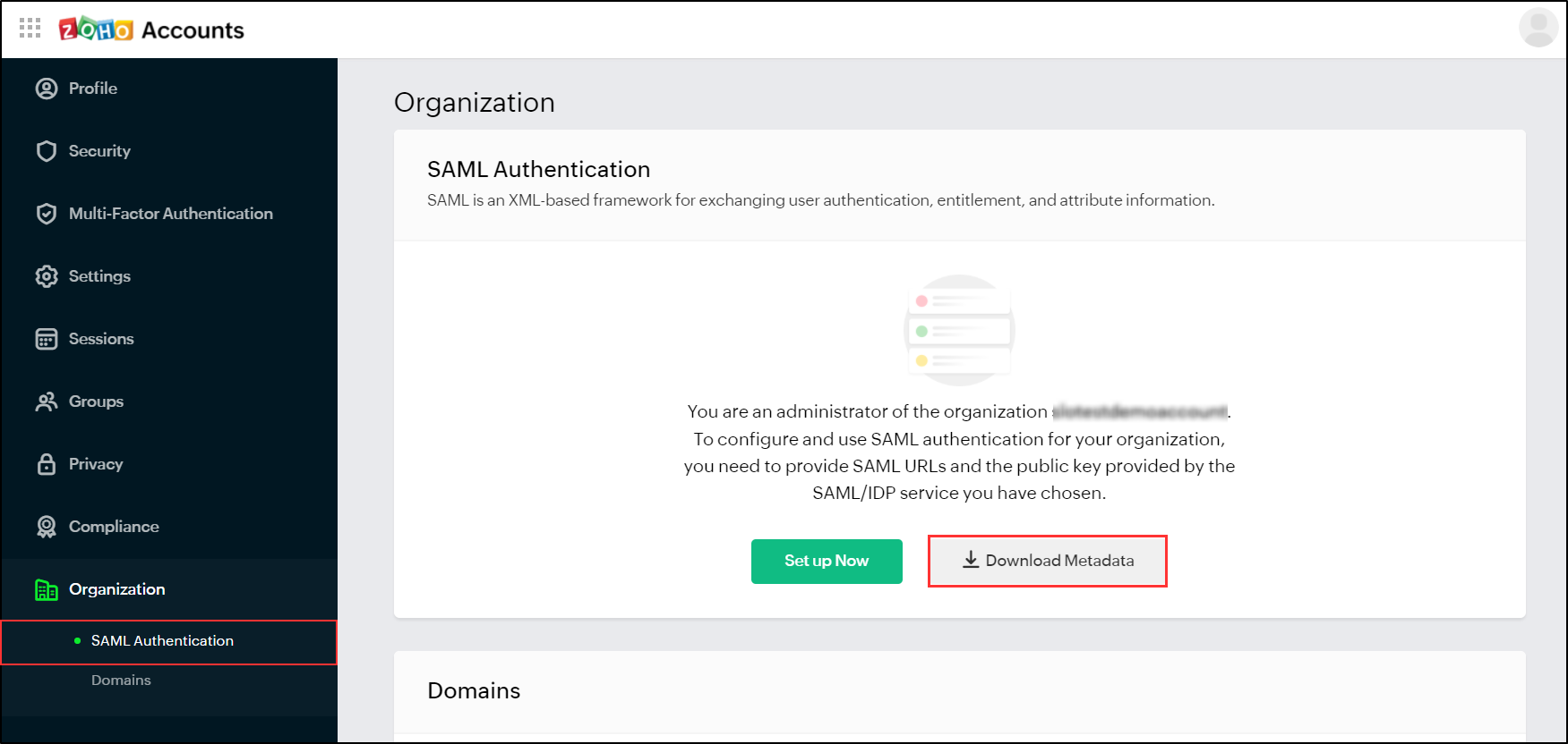 3. [メタデータをダウンロードする]をクリックします。「zohometadata.xml」という名前のファイルがダウンロードされます。