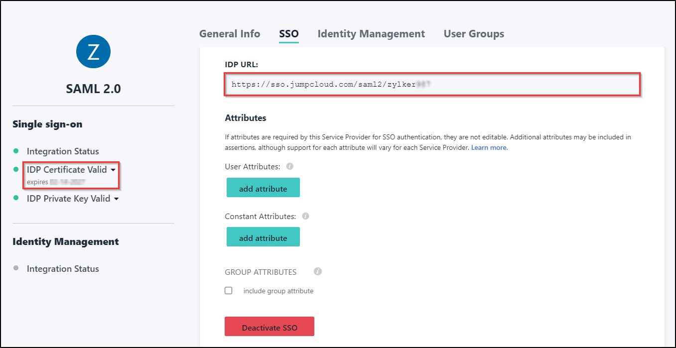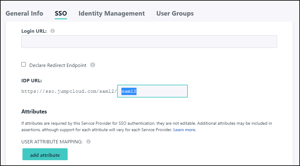 2. [SSO](シングルサインオン)のタブに移動して、IDP URL(IDプロバイダーのURL)をコピーします。