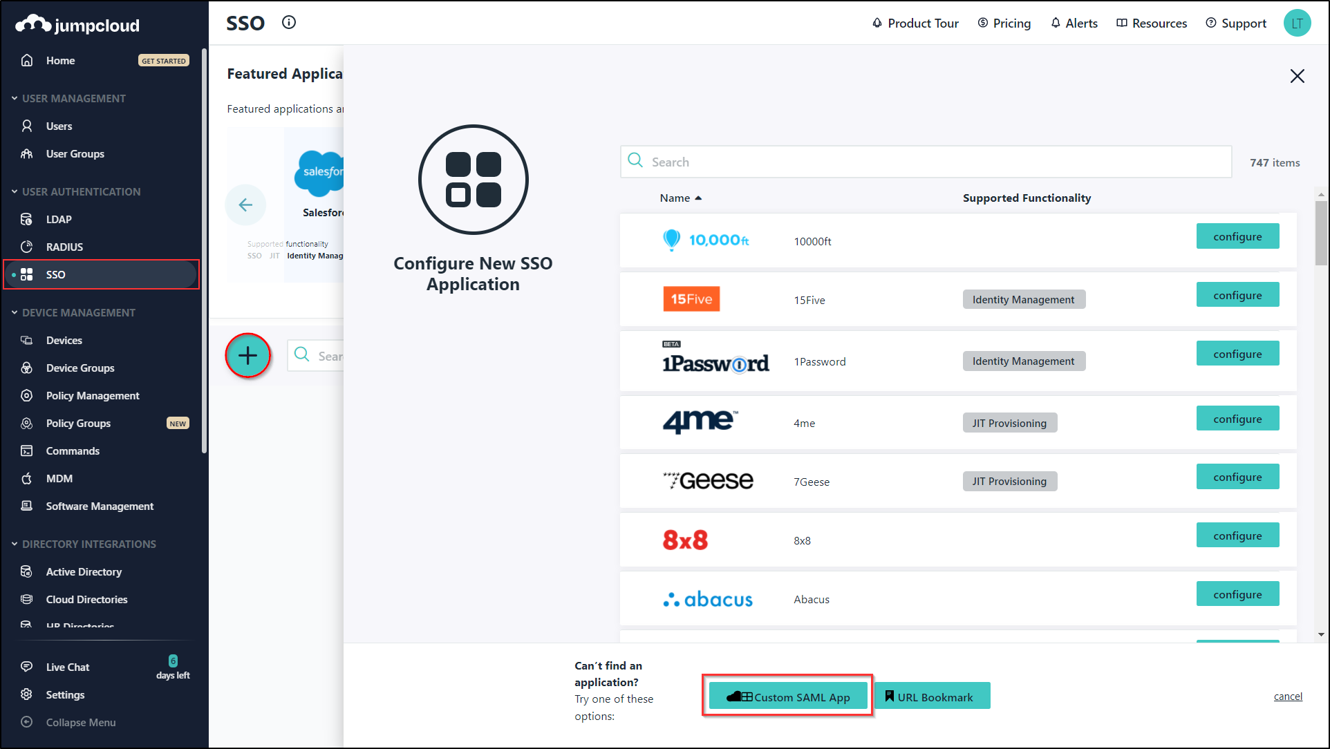 6. [+]アイコンをクリックして、[Custom SAML App](独自のSAMLアプリ)をクリックします。