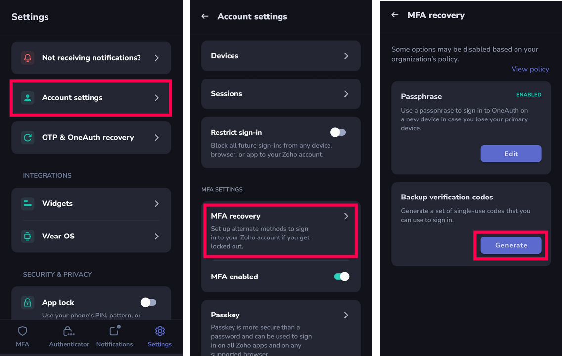 アカウントにアクセスできない場合 アカウントからロックアウトされ、サインインできない場合: あらかじめ保存しておいた バックアップ認証コード または パスフレーズ (OneAuthの場合)を使用してアカウントの復元を試行します。 組織ユーザーの場合は、組織管理者に連絡してアカウントに適用されている多要素認証を無効にします。詳細は こちら 。 アカウントにアクセスできる場合 Zohoアカウントで多要素認証を無効にするには : ...