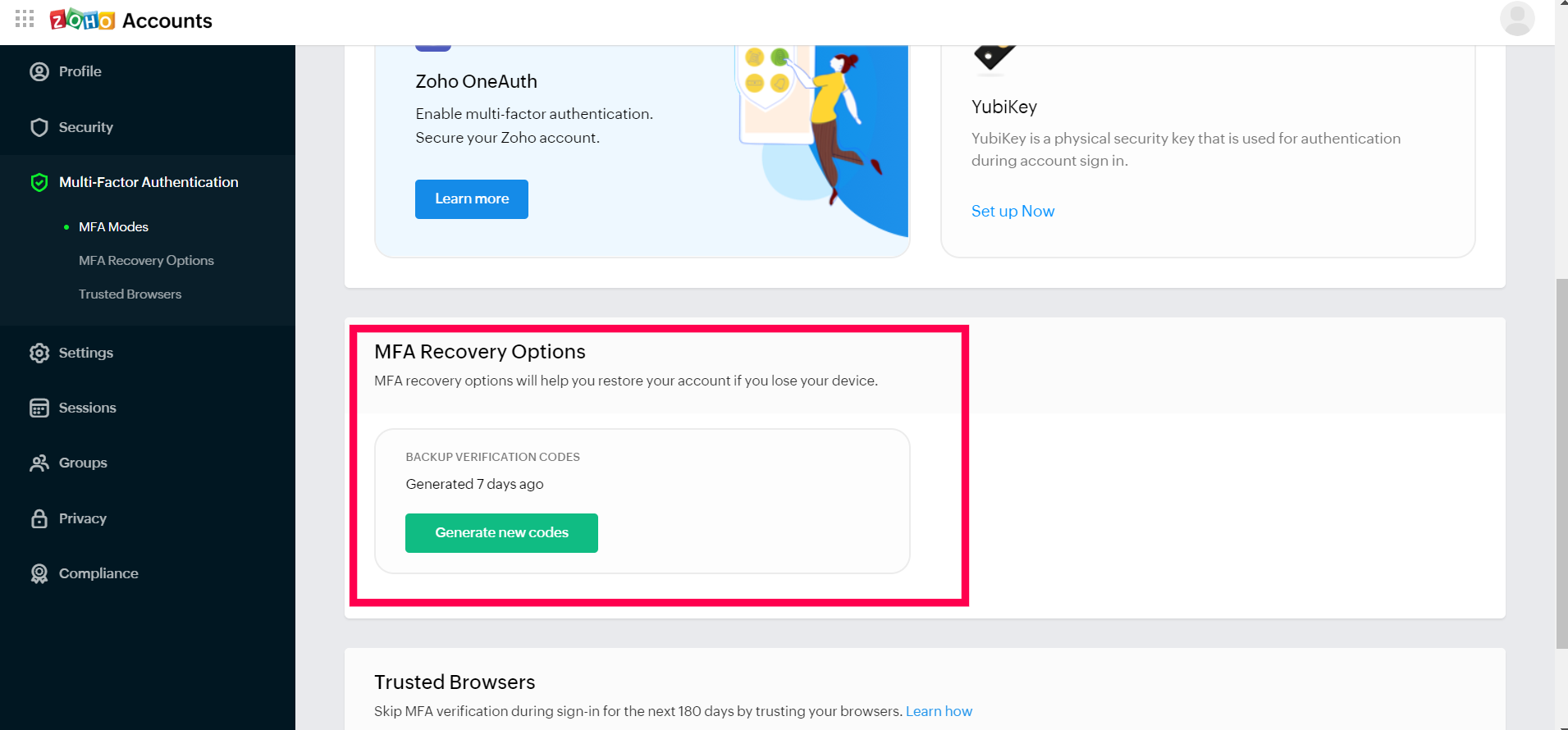 多要素認証を設定済みのデバイス(端末)にアクセスできなくなった場合、または多要素認証を使用してサインインする際に問題が発生した場合に、Zohoアカウントを回復するための12桁のコードです。コードは5件生成されます。アカウントで多要素認証を有効にすると、 accounts.zoho.com から、これらのコードを生成できます。