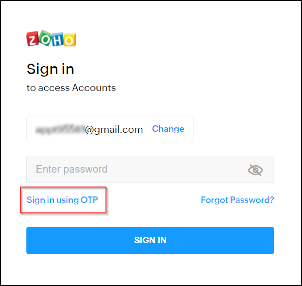 パスワードを入力する代わりに、ワンタイムパスワードを入力してZohoアカウントにサインインできます。ワンタイムパスワードの送信先には、メインのメールアドレスまたはメインの携帯電話番号のいずれかを選択できます。