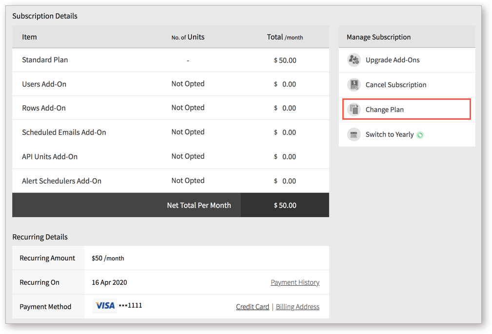 Zoho Analyticsの画面からも各プランの料金を確認できます。確認するには、 [サブスクリプション管理] → [プランの変更] の順に移動します。