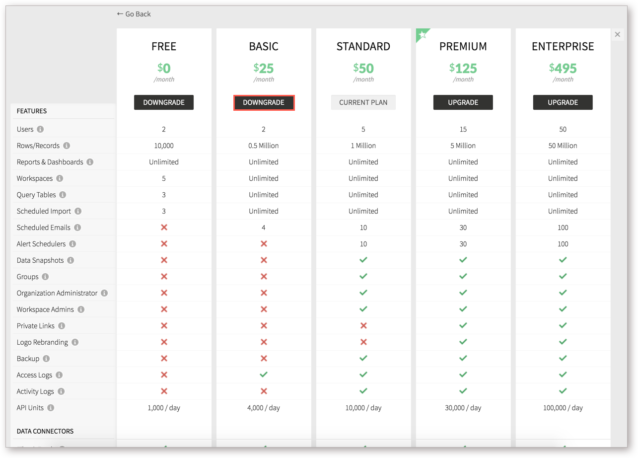 Zoho Analyticsには、ベーシック、スタンダード、プレミアム、エンタープライズの4種類の有料プランが用意されています。各プランによって、利用できる機能やユーザー/行数の上限が異なります。必要に応じてアドオンを購入し、ユーザー/行数の上限を引き上げることもできます。さらに、小規模なビジネス向けの無料プランも用意されています。