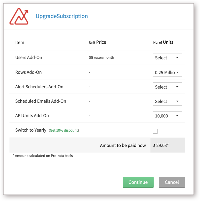 Zoho Analyticsの有料プランを購入(またはアップグレード)する際に、ユーザーまたは行のアドオンを購入できます。各プランで登録/追加できるユーザー数や行数を増やすことが可能です。アドオンを追加購入するには、以下の手順を実施します: