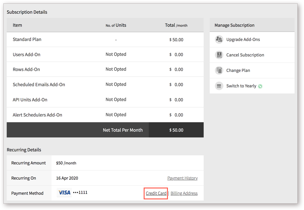 プレミアムサポート を受けるには、アドオンとして購入する必要があります。購入するには、Zoho Analyticsのサブスクリプション管理ページから手続きを行います。