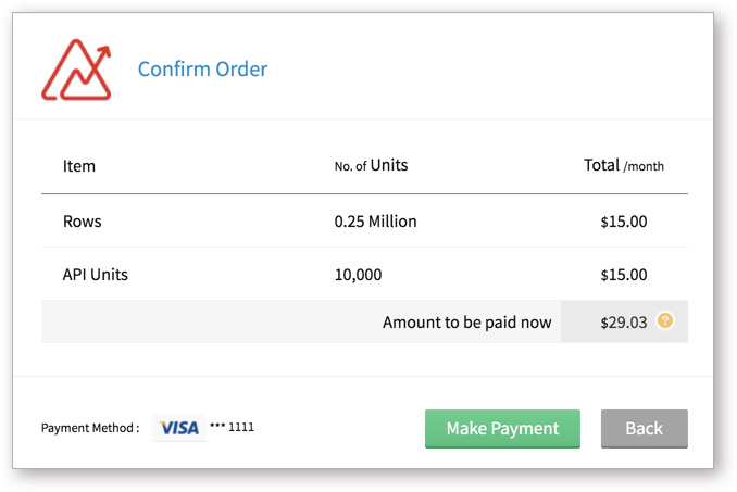 クレジットカードで料金を支払うことができます。Zoho Analyticsの有料プランを購入する際に、クレジットカードの詳細情報を入力します。以降、はじめて購入した日付と同じ日に毎月自動で支払い処理が行われます。