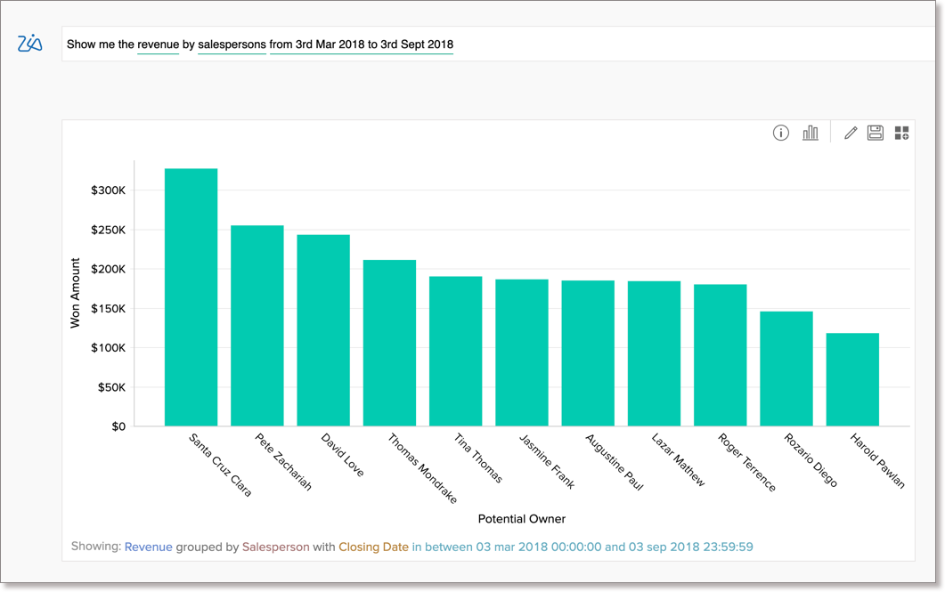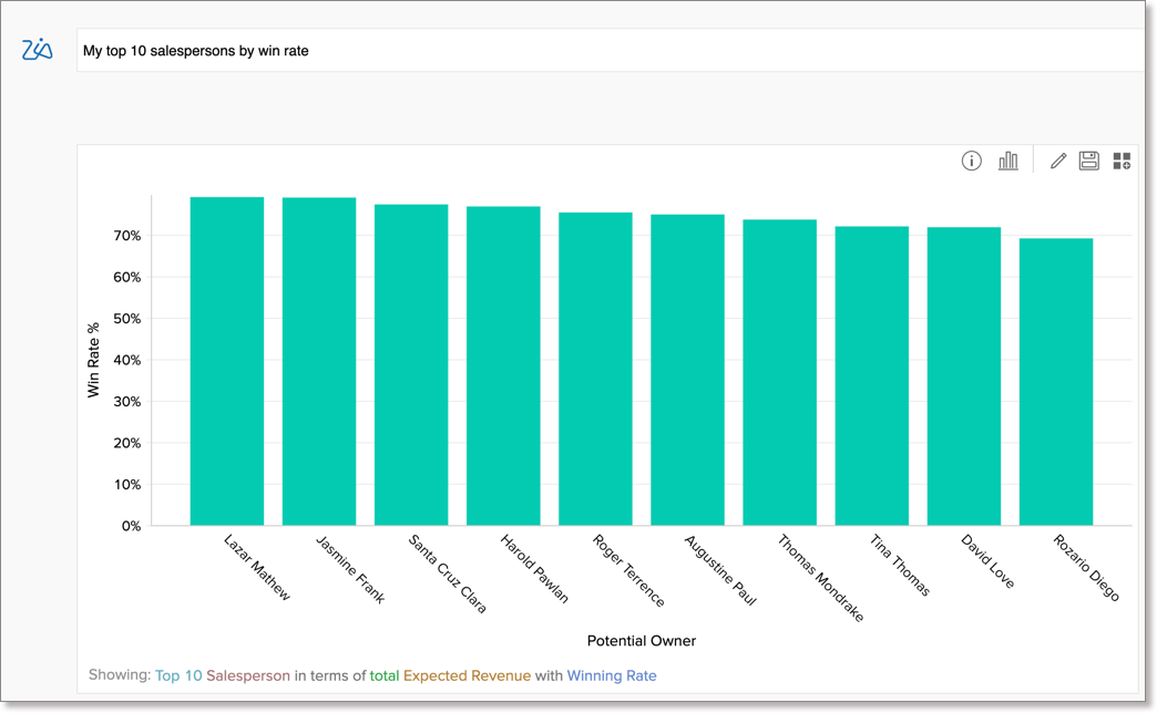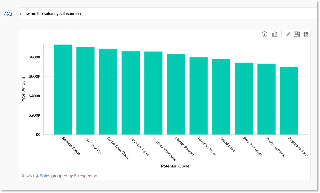 「Top 10」、「Bottom 5」、「Highest」、「lowest」、「most」、「recent」などの語句を使用することで、上位10件や下位5件などの特定の範囲データを抽出できます。 以下の質問の例では、上位10人の営業担当者のデータが表示されます。