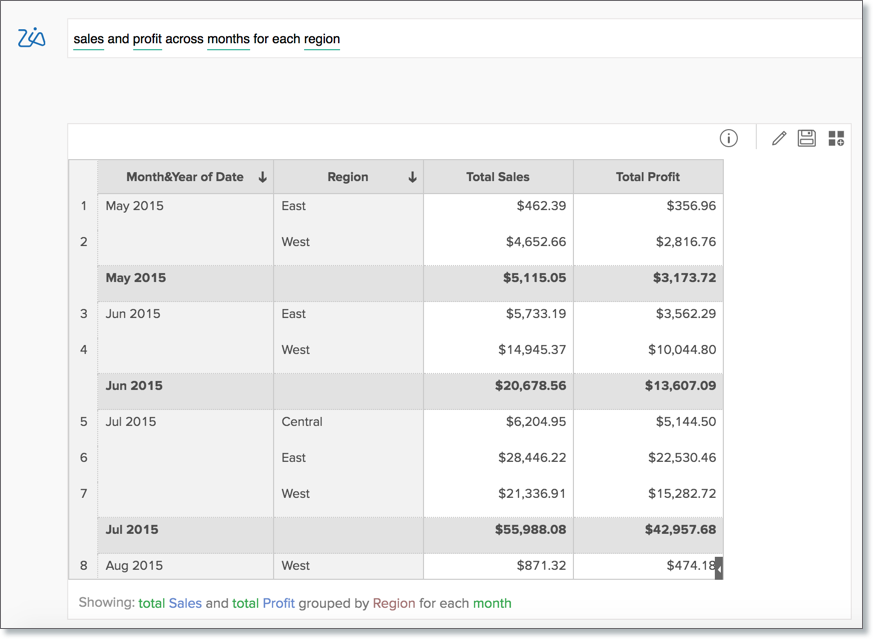 以下の質問の例では、「Sales」(売上)と「Profit」(利益)の列が、「Date」(日付)と「Region」(地域)の列によってグループ化されます。
