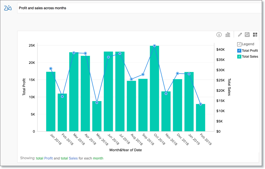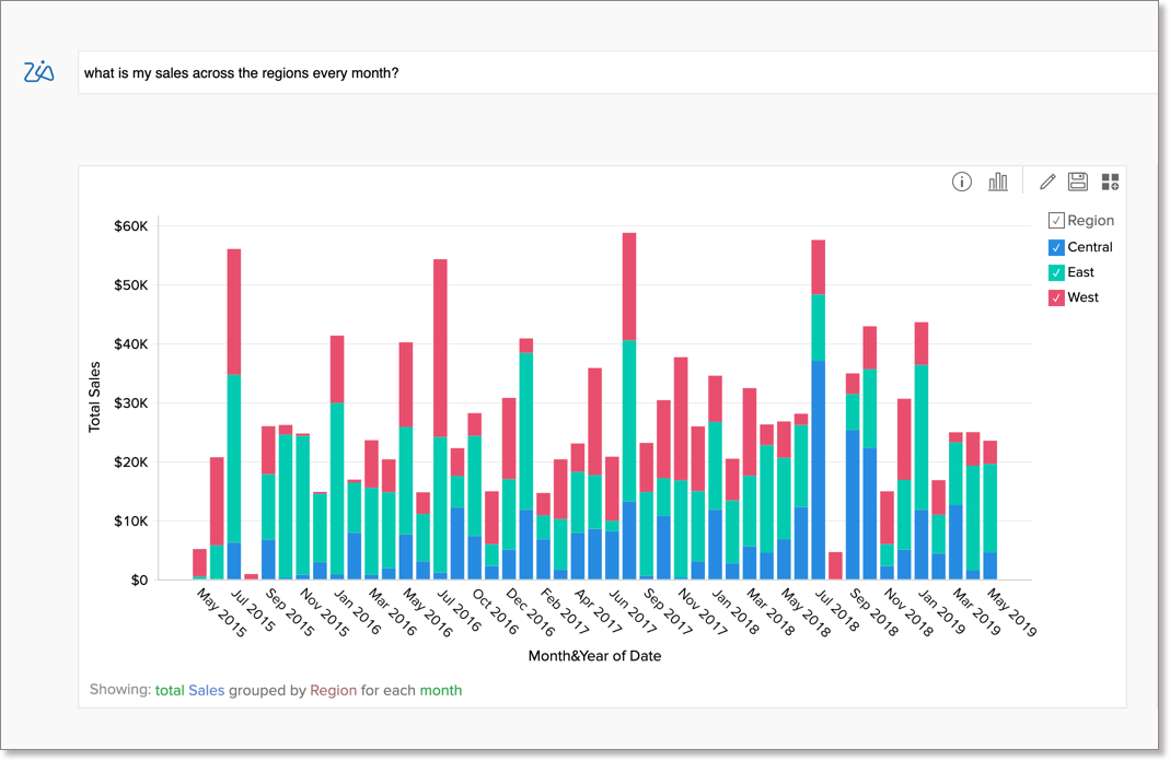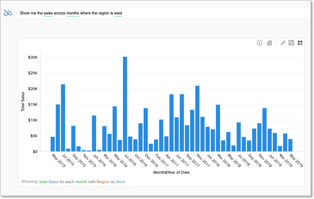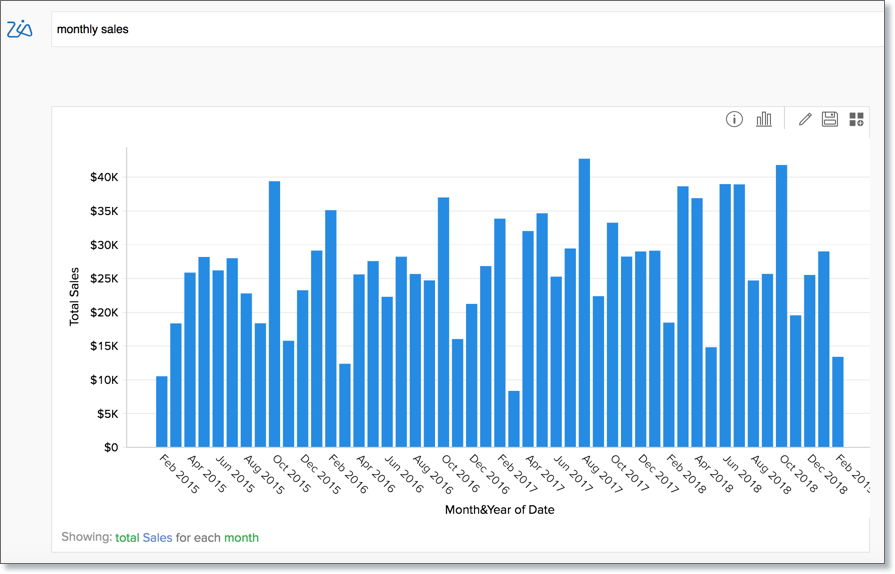 データ内の情報を明確に指定せず、あいまいに質問することもできます。「Ziaに質問」では、yearly(毎年)、quarterly(毎四半期)、monthly(毎月)、daily(毎日)といった用語が識別されます。以下の質問の例では、「Monthly」(毎月)という用語が識別され、日付の列のデータをもとに月ごとの売上が表示されます。