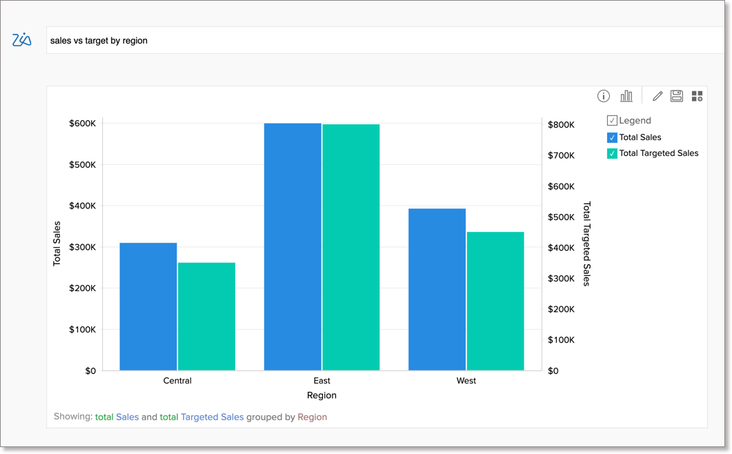 データ内の情報を明確に指定した質問が可能です。たとえば、データ内に「Sales」(売上)と「Region」(地域)の列があるとします。以下の質問を行うと、各地域における売上の合計が表示されます。