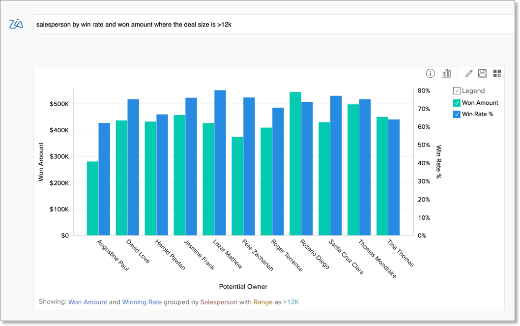 数値の列の値をフィルター条件として指定できます。数値の範囲を指定したり、「greater than 10」、「< 10」、「most」、「highest」、「lowest」などの語句を使用して一定の数値を上回る/下回る値や、最大/最小の値を抽出したりできます。 以下の質問の例では、「Deal Size」(金額)が$12,000を超える商談に関する受注率と受注額のデータが表示されます。