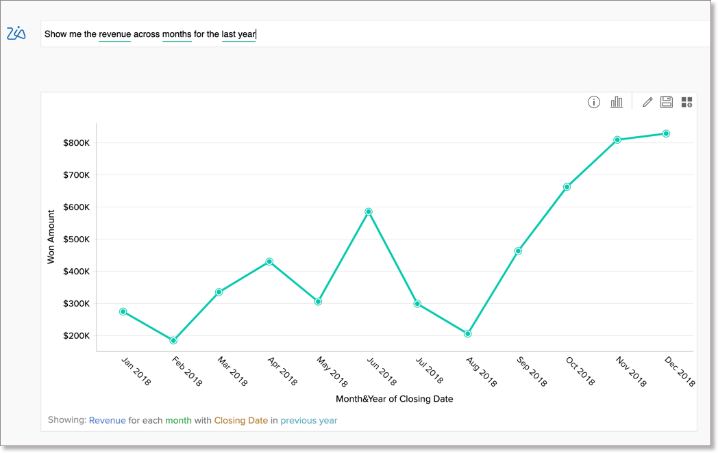 相対的な日付 - 「This Month」(今月)、「Last Quarter」(前四半期)、「Today」(今日)などの語句を使用することで、現在の日付を起点とした相対的な期間のデータを抽出できます。 以下の質問の例では、過去1年間における「Revenue」(売上)のデータが表示されます。