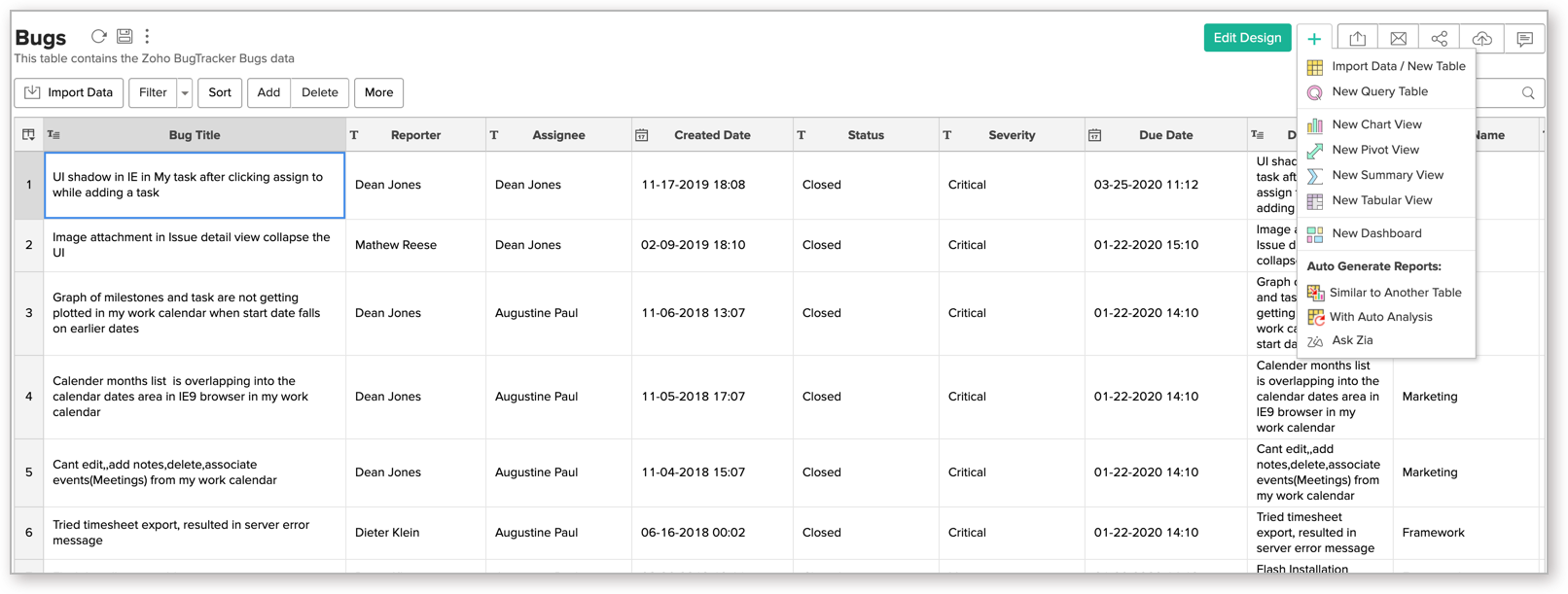 ただし、既存のワークスペースに新しいテーブルを追加し、新しく追加したテーブルにZoho BugTrackerのデータをインポートすることで、このテーブルのデータと他のデータを組み合わせてレポートを作成できます。詳細については、こちらをご参照ください。