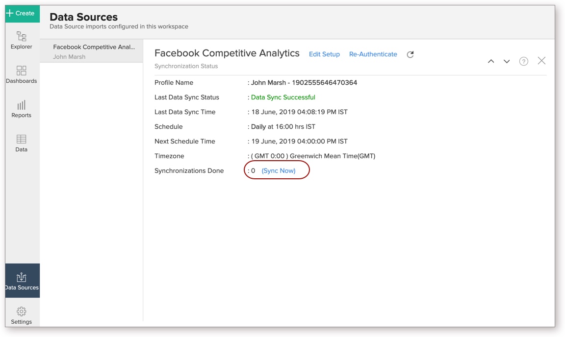 設定後、初回のデータが取得されるまで時間がかかる場合があります。データの取得にかかる時間は、Zoho AnalyticsにインポートするFacebookのデータの量によって異なります。インポートが完了すると、メール通知が送信されます。初回のデータが取得される前にワークスペースにアクセスしてもデータは表示されませんのでご注意ください。