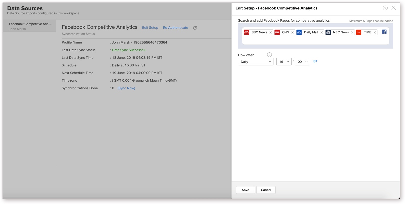Facebook競合分析用の詳細分析コネクターを使用すると、自社のFacebookページのデータを競合他社のFacebookページのデータと比較し、効率よく分析できます。この詳細分析コネクターでは、最大5件のFacebookページと比較することが可能です。 自社のFacebookページと競合他社のFacebookページに関する指標データを比較/確認することで、各社の強みや弱みを分析し、自社のソーシャルメディアマーケティングの最適化を図ることができます。また、詳細分析コネクターを使用することで、上記のZoho Analyticsの機能をすべて利用できるようになります。