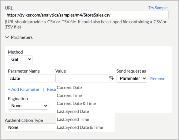 はい。パラメーターが使用されている動的URLからデータをインポートできます。たとえば、データのインポート元となるURLに現在の日時のパラメーターが含まれている場合、[現在の日付]、[現在の時刻]、[現在の日時]などのパラメーターをZoho Analyticsで指定することが可能です。  これにより、日付によって動的に変化するURLからデータをインポートすることができます。