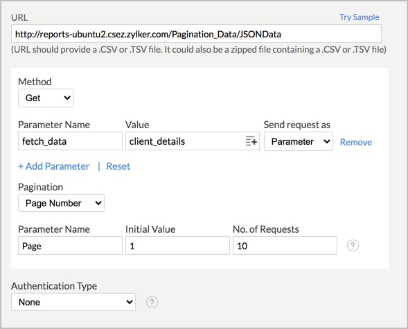 • ページ番号:データが複数のページに保存されており、これらのデータを一連のデータとしてZoho Analyticsにインポートしたい場合に選択します。[ページ番号]を選択する場合は、インポートの設定画面の[パラメーター]の欄で以下の詳細情報を入力する必要があります: