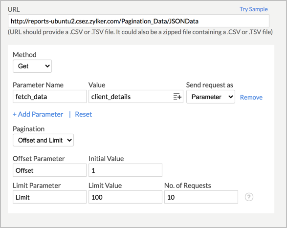 • 現在の指定地(オフセット)と上限:データ量の多いデータを分割してZoho Analyticsにインポートする場合に選択します。[現在の指定地(オフセット)と上限]を選択する場合は、インポートの設定画面の[パラメーター]の欄で以下の詳細情報を入力する必要があります:
