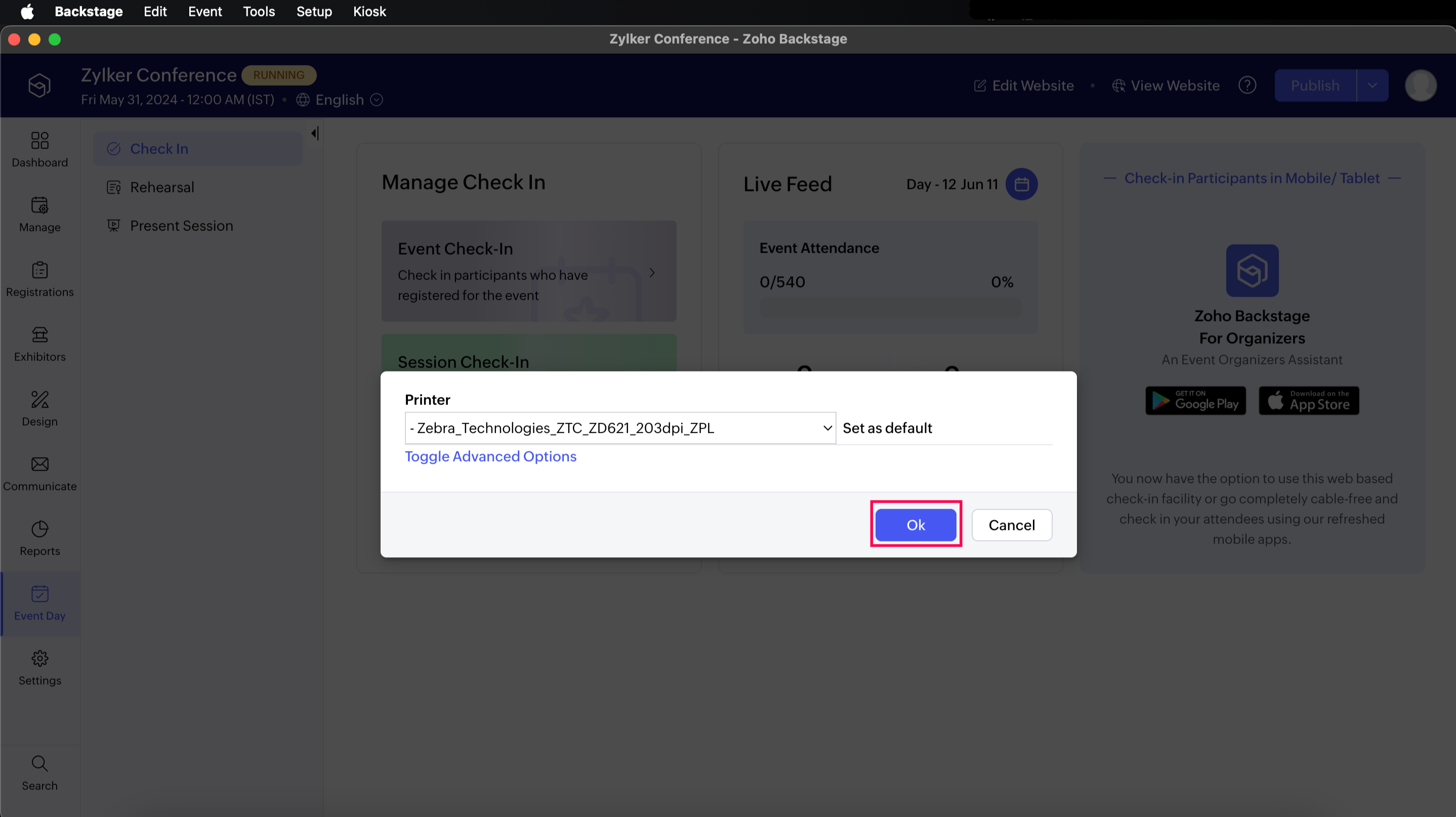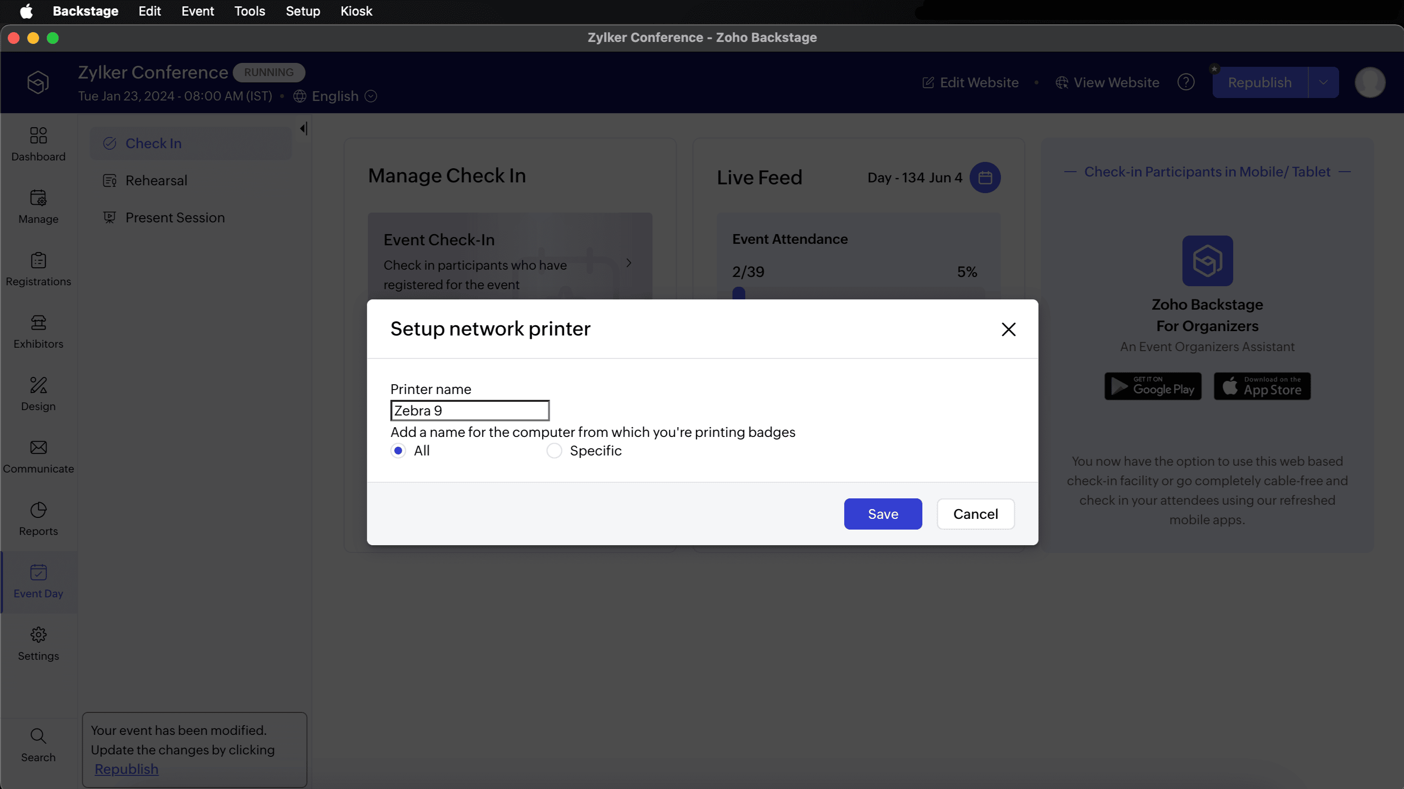 Zoho Backstage デスクトップアプリの有線接続機能を利用し、イベント用バッジを簡単に印刷できます。デスクトップとUSB対応プリンターを接続することで、イベント会場でスムーズなバッジ印刷が可能です。以下の簡単な手順に従ってプリンターを設定し、すぐにバッジ印刷を開始できます。