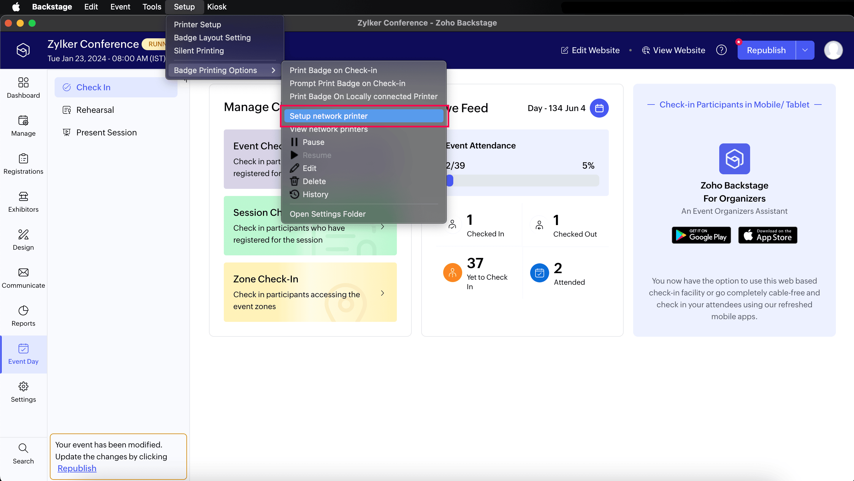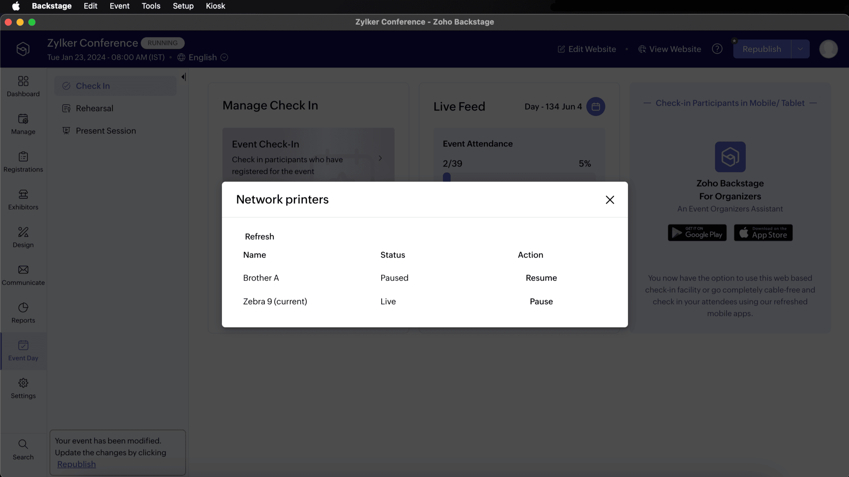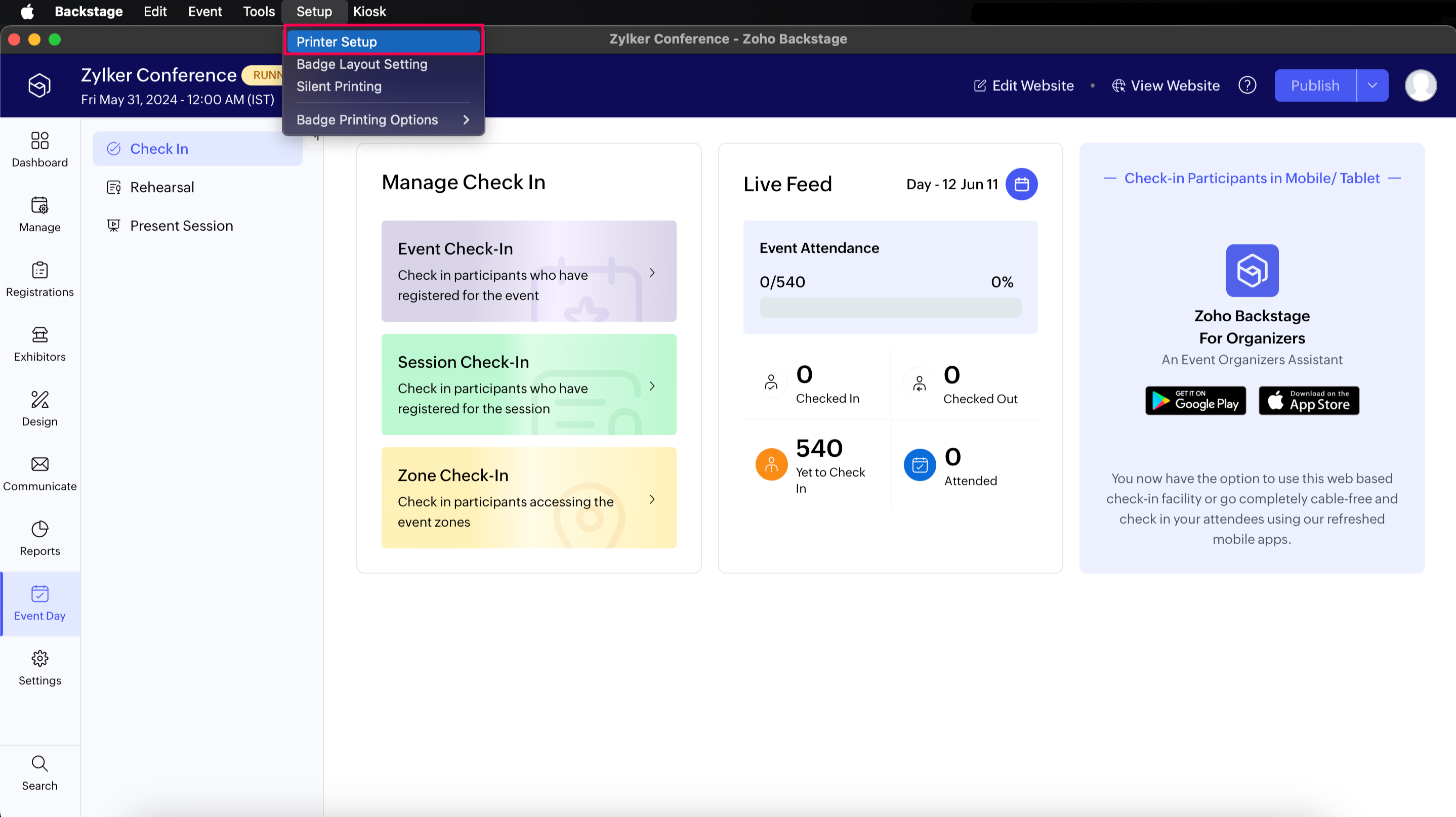 イベント当日は、参加者のチェックインをモバイルフォン、iPad、またはラップトップなど、さまざまなデバイスでBackstage Organizerアプリやウェブアプリを使って行えます。事前にデスクトップアプリでプリンター設定を済ませておくと、チェックインが完了した際、参加者バッジが自動で印刷されます。