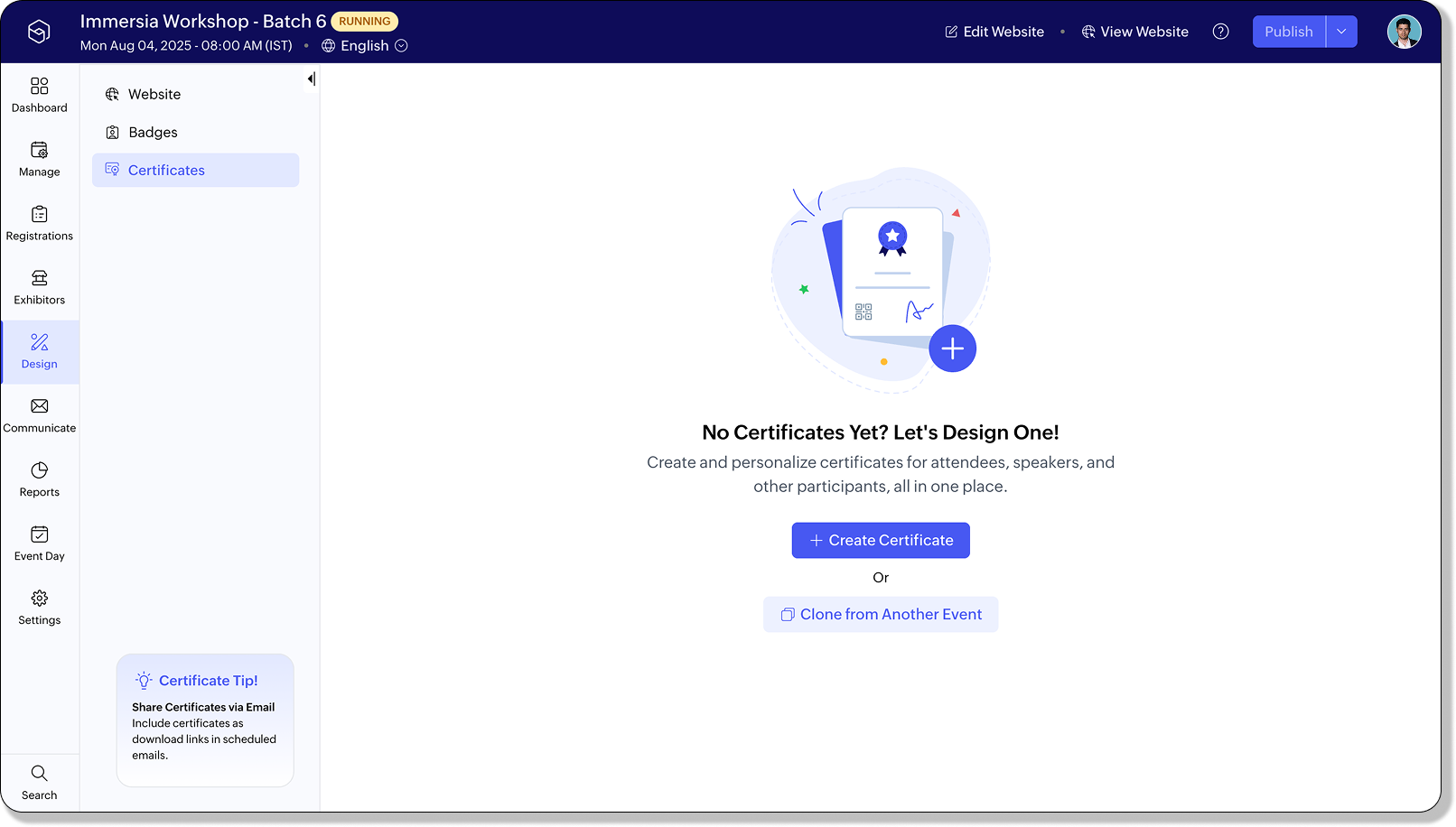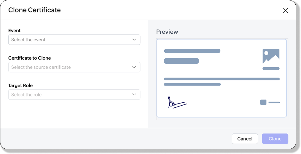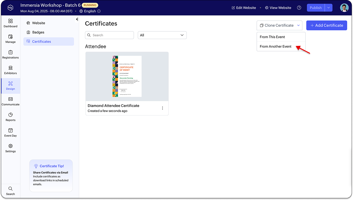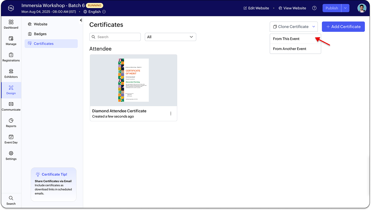 既存のテンプレートを複製することで、同じイベントまたは別のイベントからcertificateデザインを再利用できます。処理や役割ごとにデザインの一貫性を保ちたい場合、新規にcertificateを一から作成する手間を省けます。