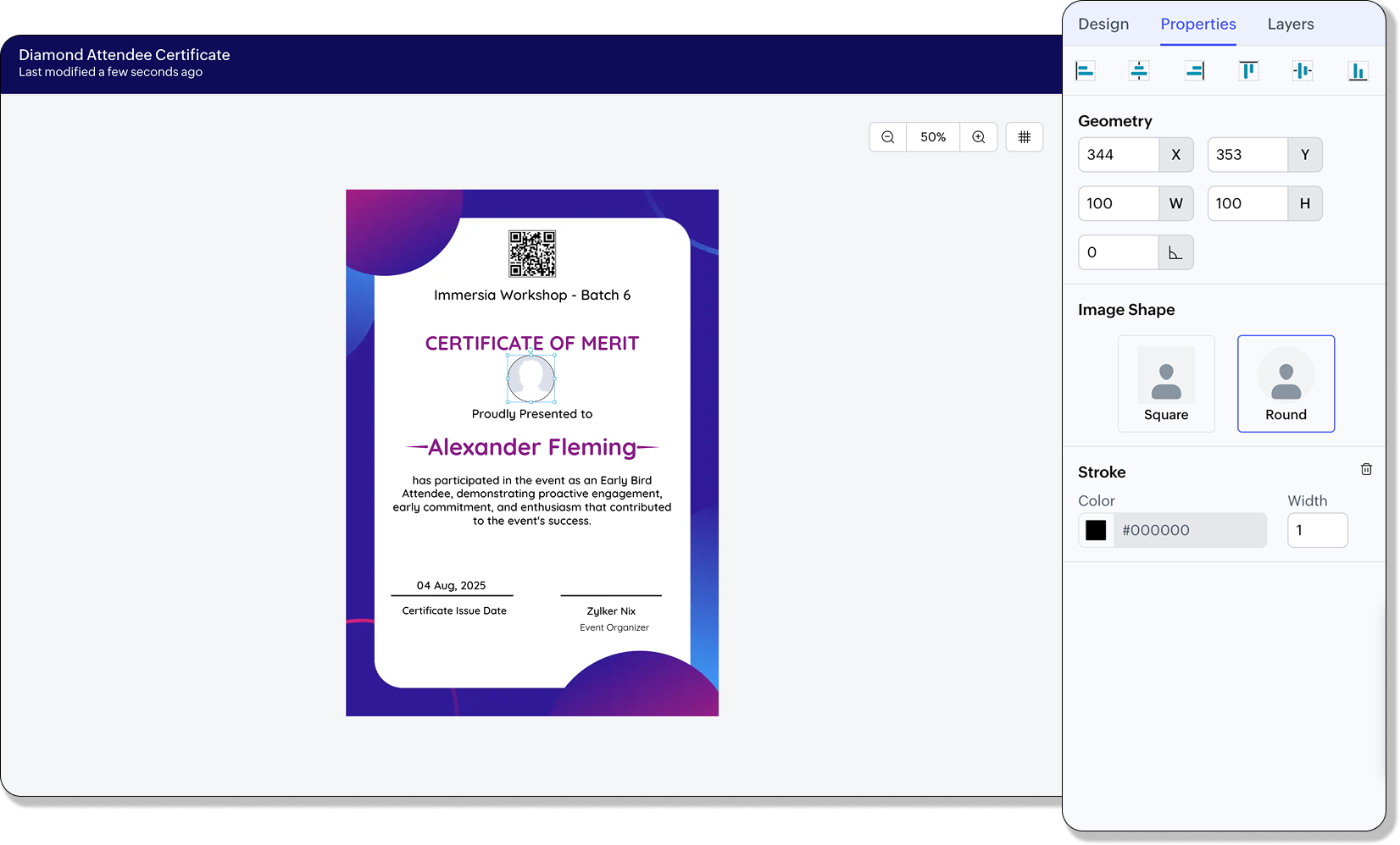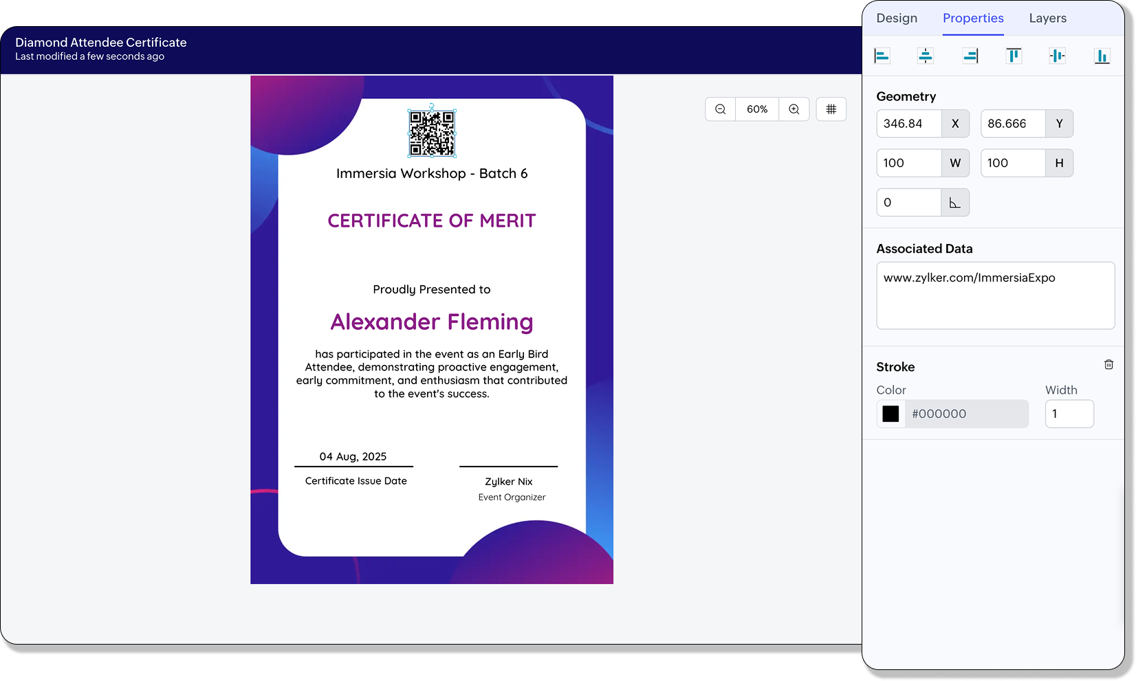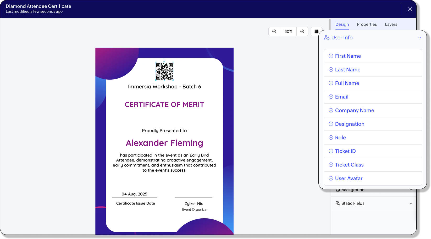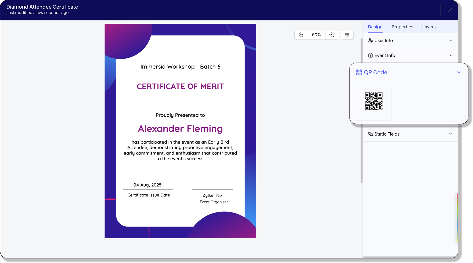 この複製したcertificateは、他のテンプレート同様に編集可能です。背景の変更、QRコードの追加、ユーザー/イベント項目の調整などが行えます。