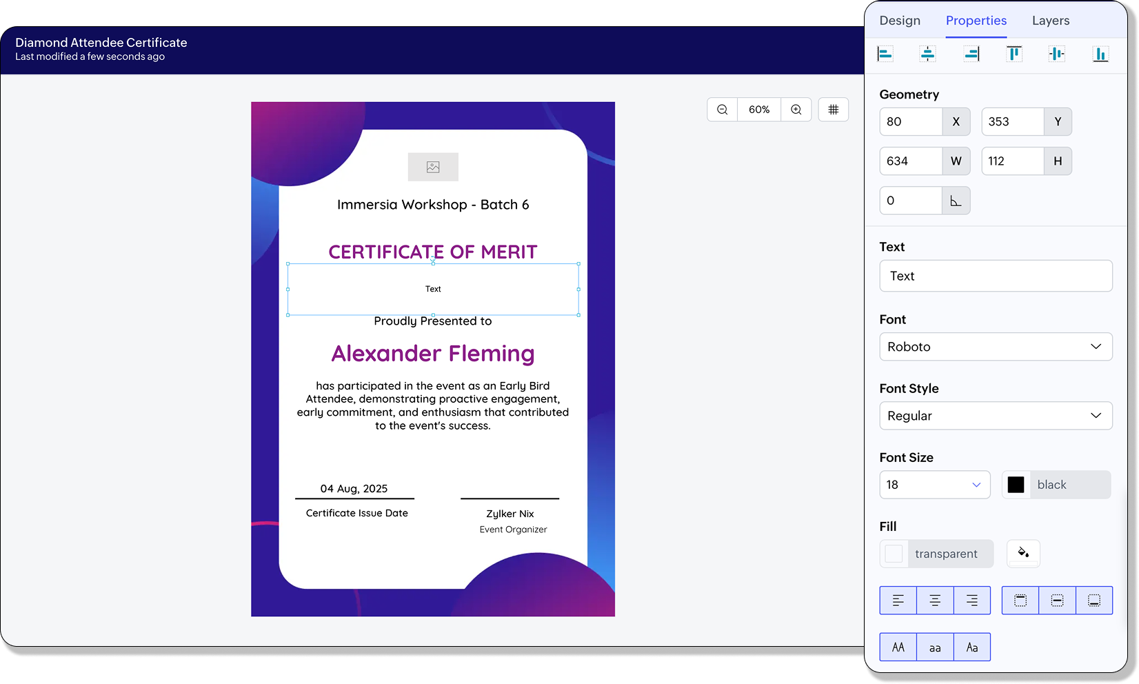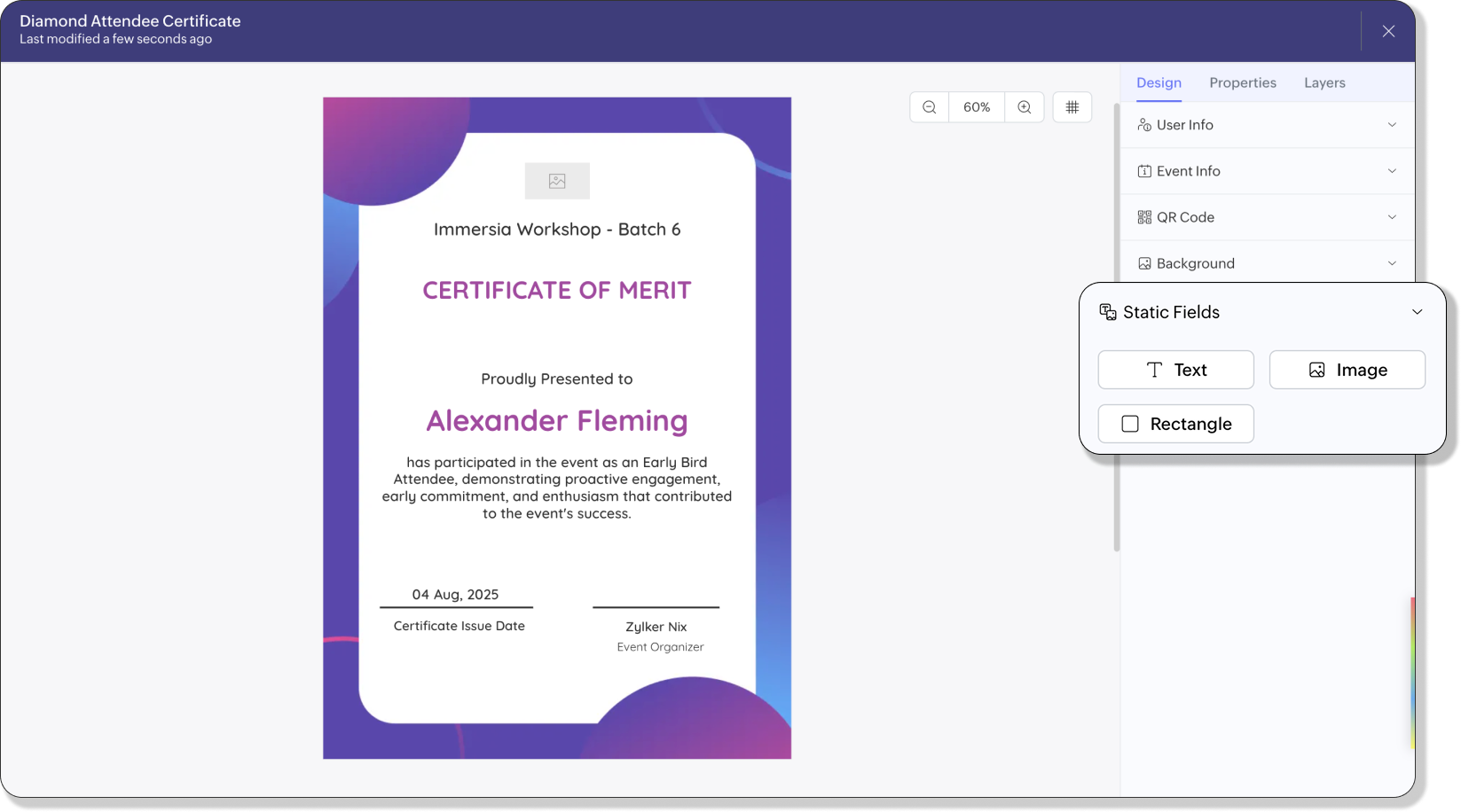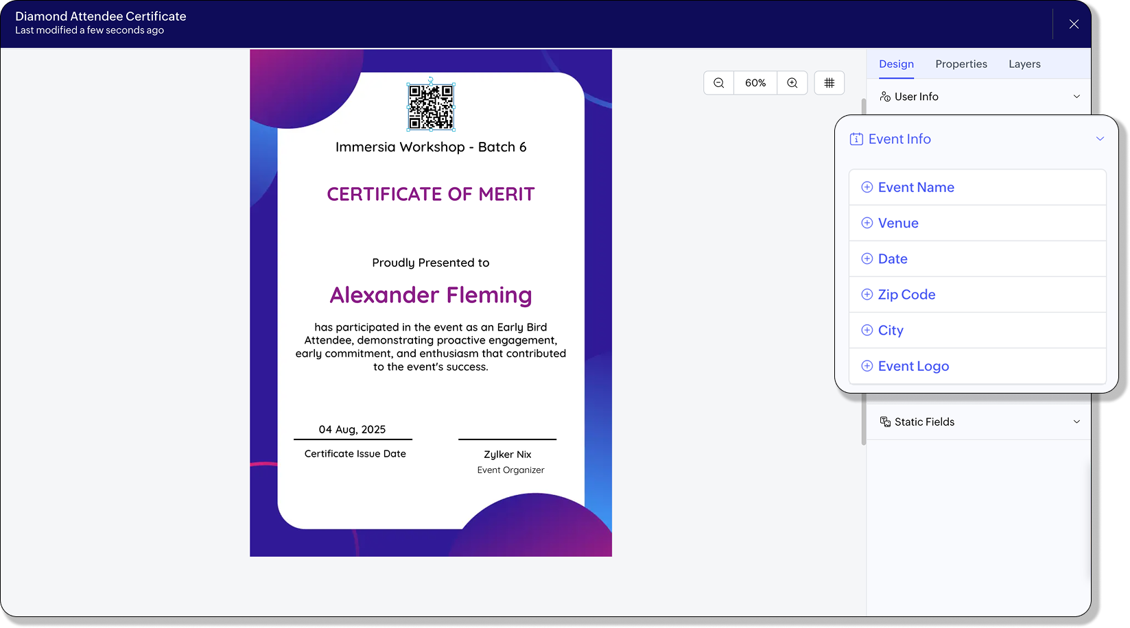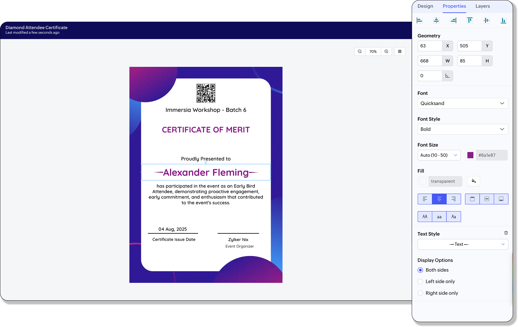 この複製したcertificateは、他のテンプレート同様に編集可能です。背景の変更、QRコードの追加、ユーザー/イベント項目の調整などが行えます。