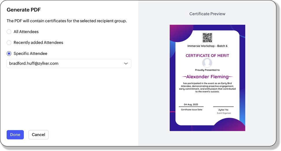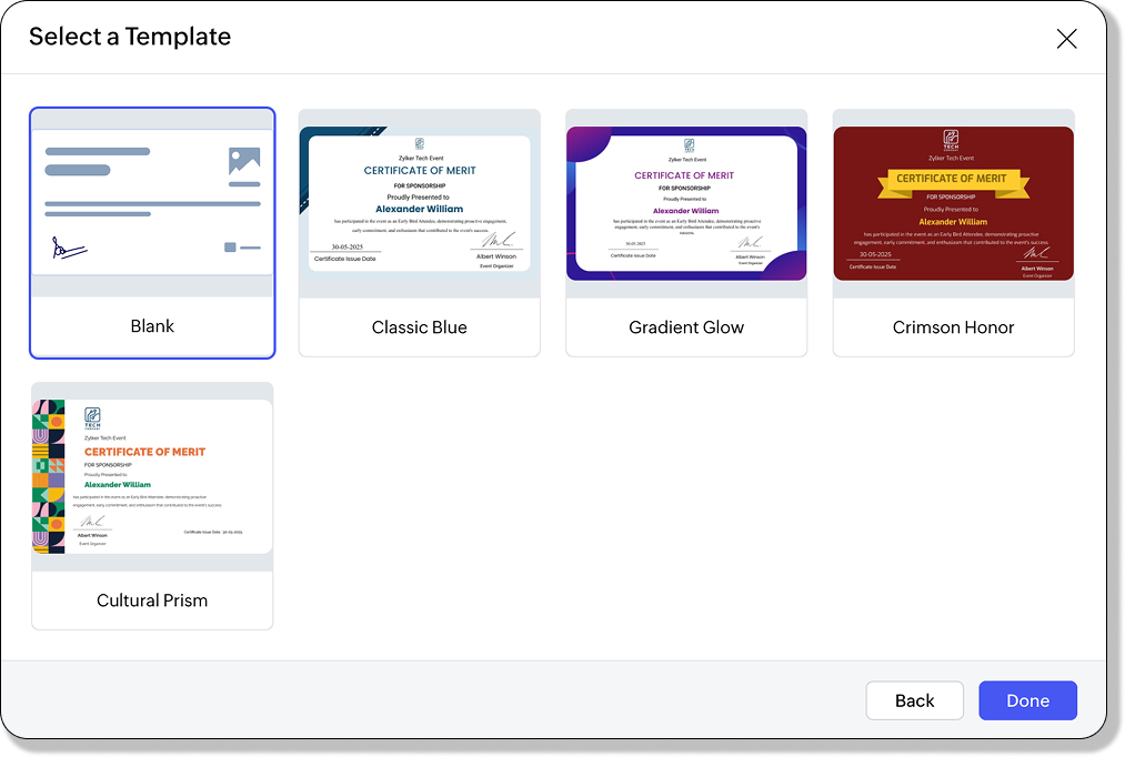 Zoho BackstageのCertificate Builderを使用して、イベント参加者向けのプロフェッショナルでブランド化された証明書を作成できます。参加者やスピーカー、スタッフ、スポンサーなど、さまざまな役割に応じた参加証・感謝状・表彰状を柔軟なデザインで生成・配布できます。証明書はイベント情報やユーザー固有の項目でカスタマイズ可能で、背景色や画像の適用、認証用QRコードの挿入、署名画像のアップロードも可能です。テンプレートは他のイベントで再利用したり、過去のテンプレートから複製して素早く設定を行うことができます。作成完了後は、証明書をダウンロードしたり、参加者へ直接メール送信することもできます。