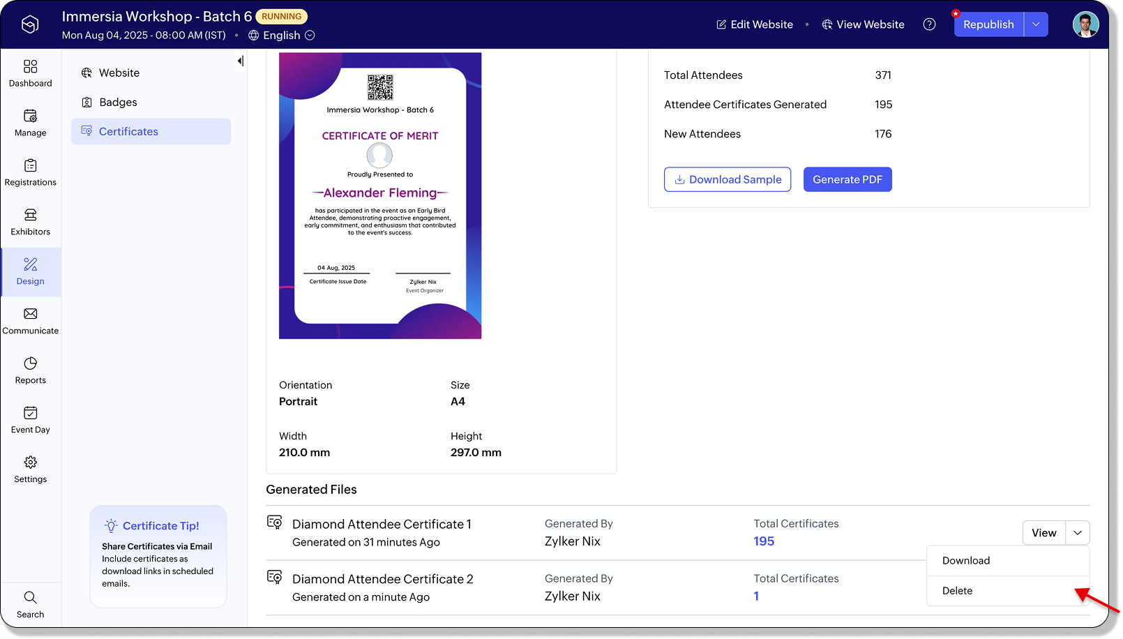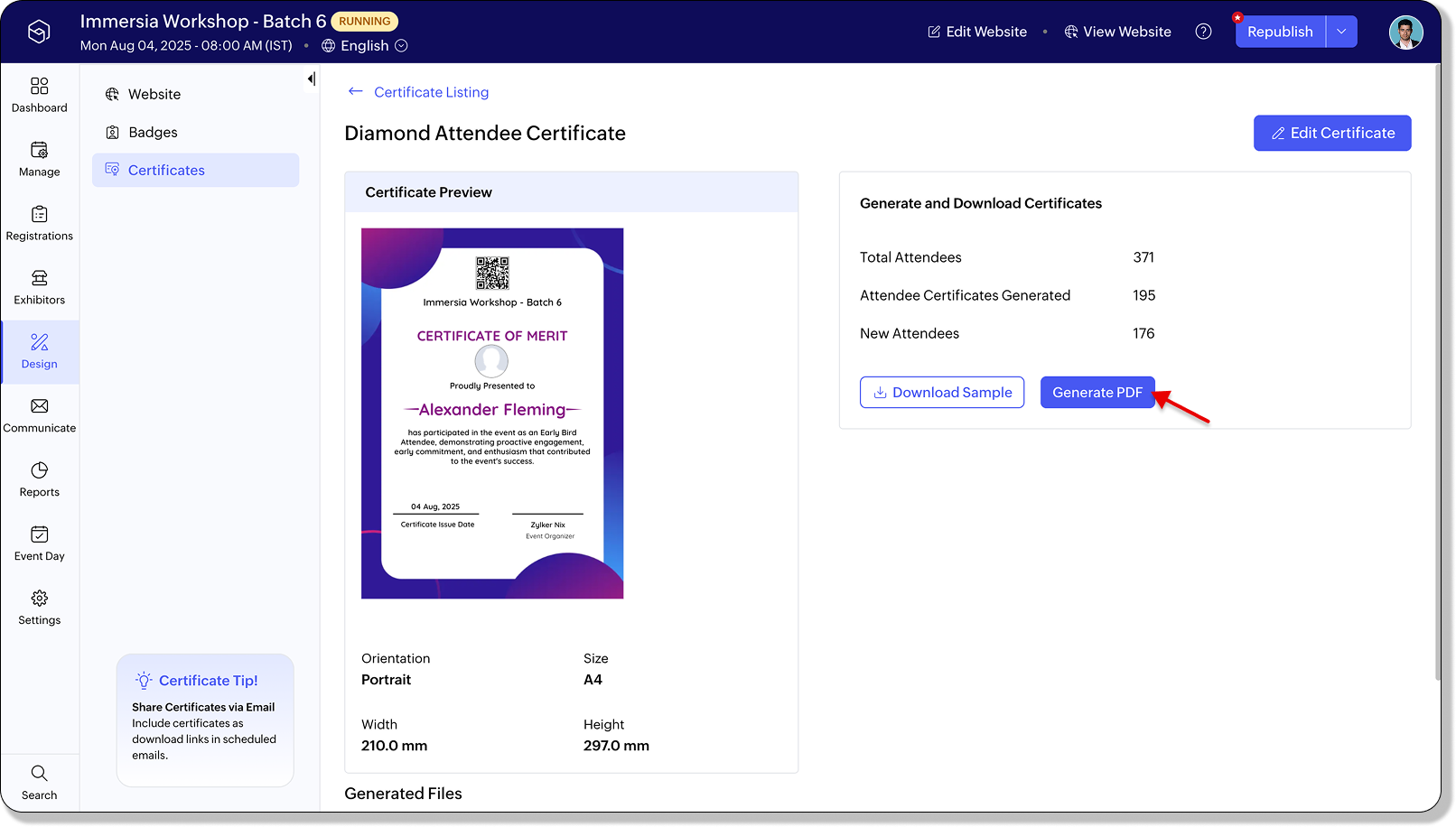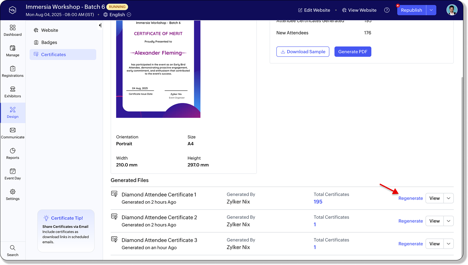 - 生成・ダウンロード証明書セクションでは、総受取人数、すでに作成済みの証明書、生成保留中の数が表示されます。