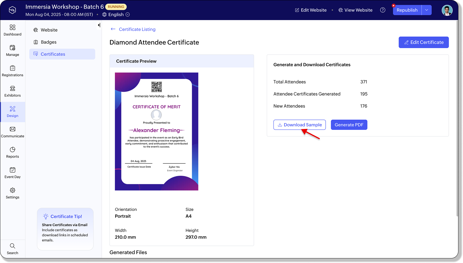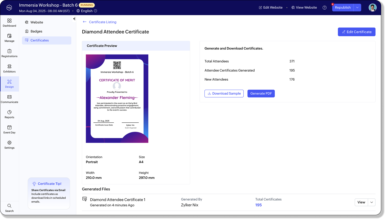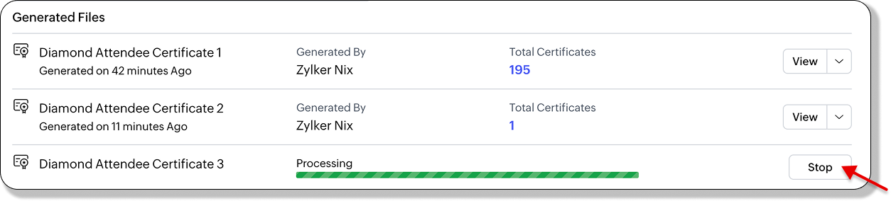 - 生成・ダウンロード証明書セクションでは、総受取人数、すでに作成済みの証明書、生成保留中の数が表示されます。