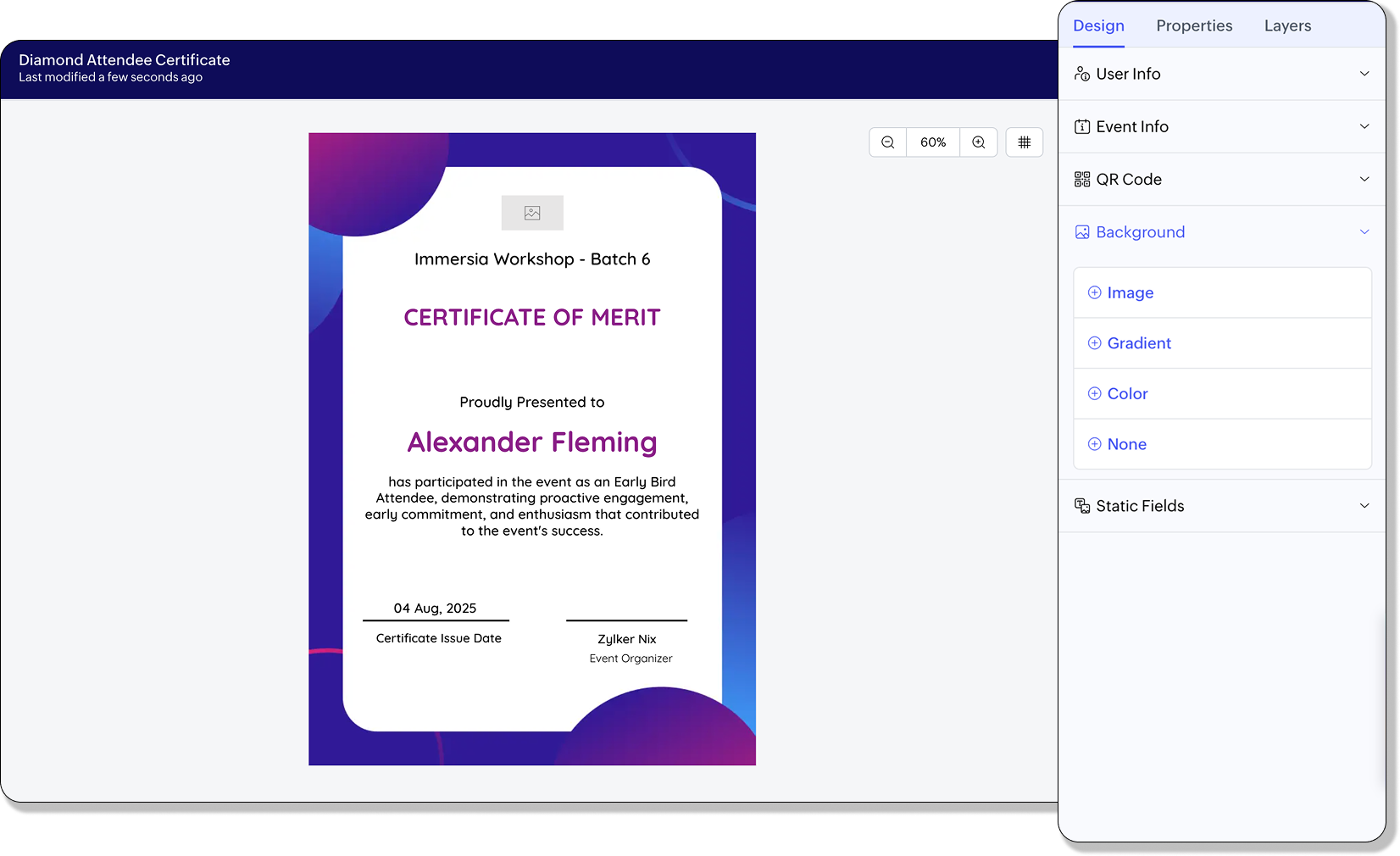 - 背景: 画像、グラデーション、または単色で証明書の背景をカスタマイズします。