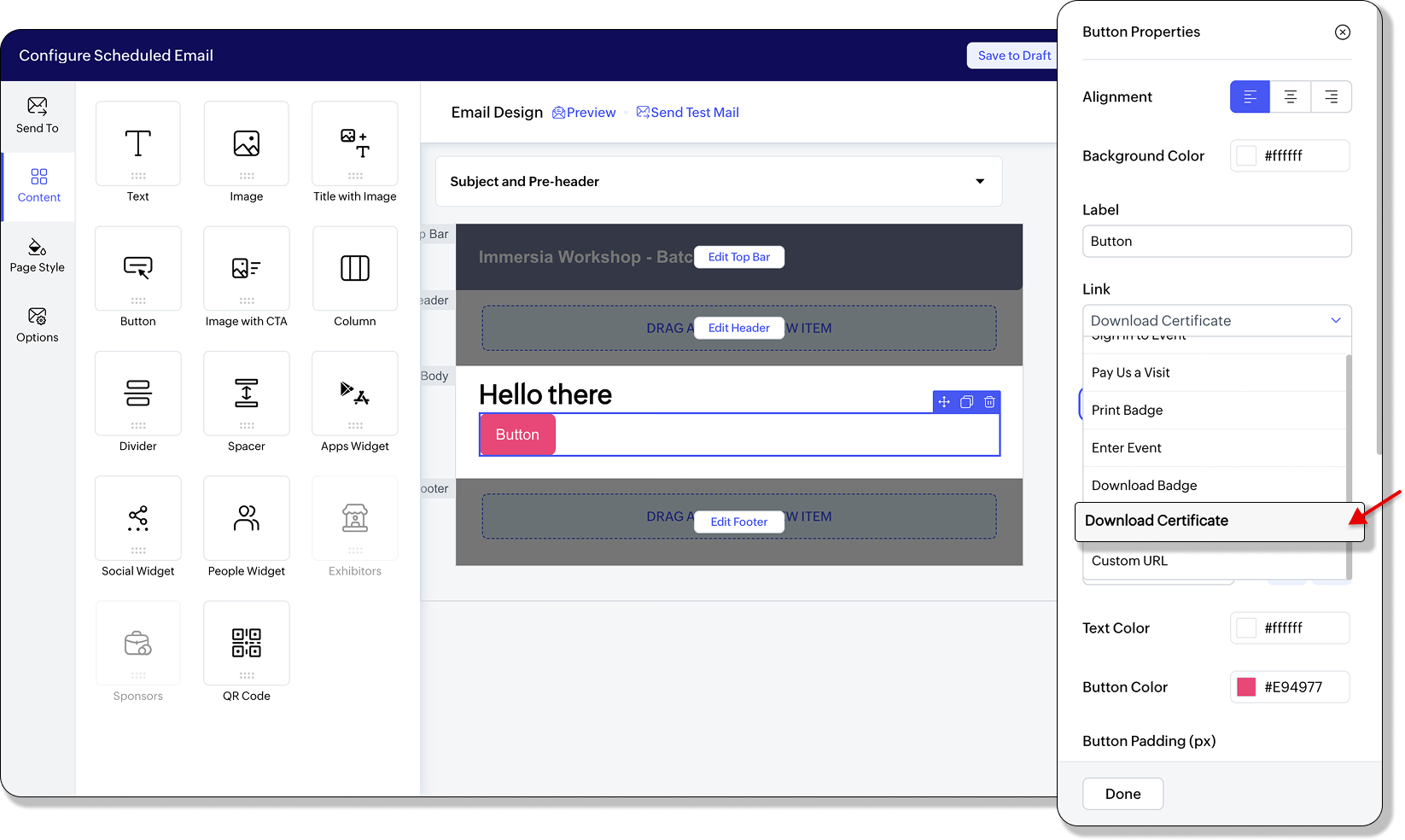 - Contentタブに移動し、コンテンツブロックをメールデザイン領域にドラッグします。必要に応じて内容を編集してください。