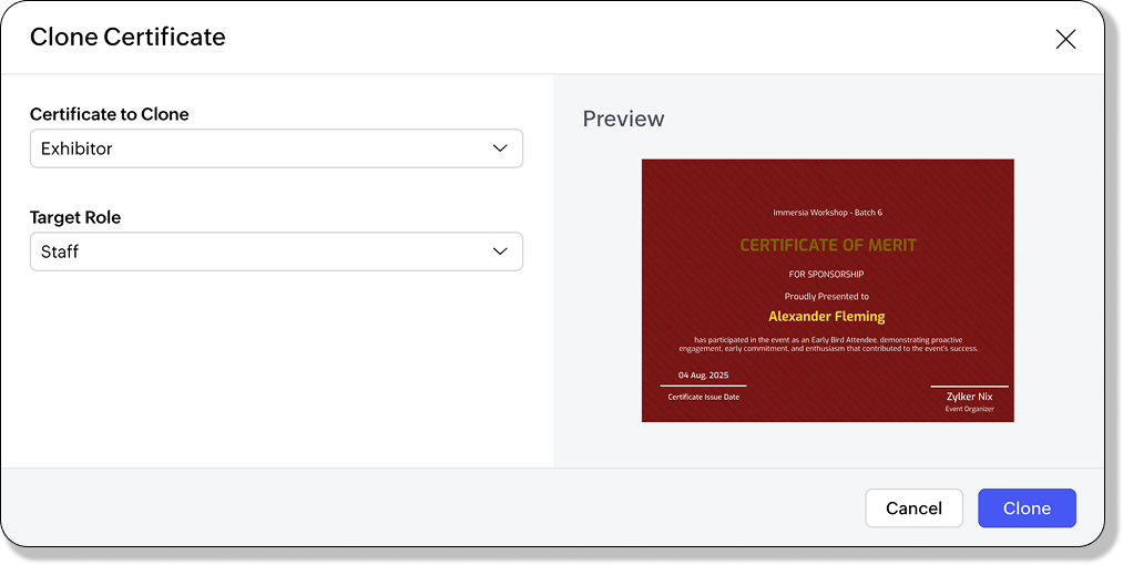 同じイベント内で証明書を複製する場合(例:スピーカー証明書をスタッフ用に再利用する場合)、以下の手順に従ってください。