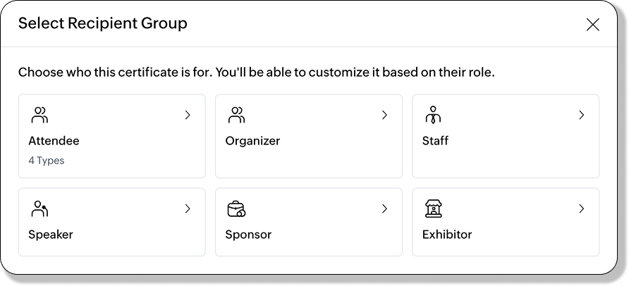 まず、証明書の対象者を定義します。参加者を表彰したり、スタッフに感謝を伝えたり、スピーカーやスポンサーに謝意を示すなど、この最初のステップで適切なメッセージを届ける相手を明確にしましょう。