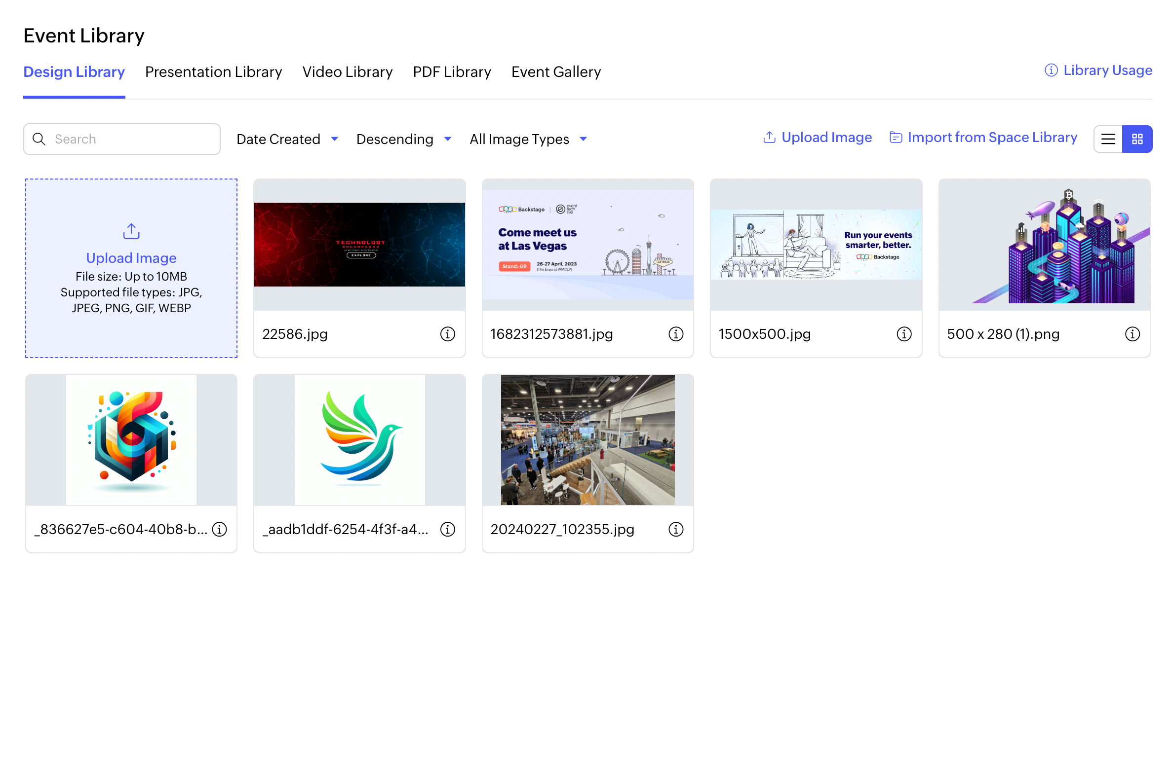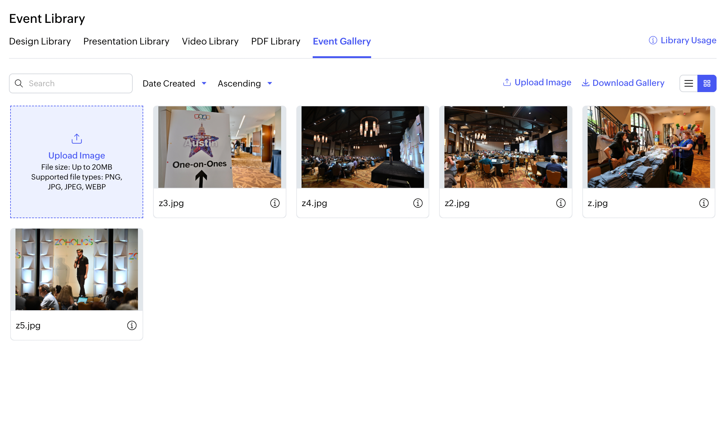 1. 管理 > Event Library > Event Galleryタブに移動し、Dockからアクセスします。イベントWebサイトからアップロードされたすべての画像がここに表示されます。