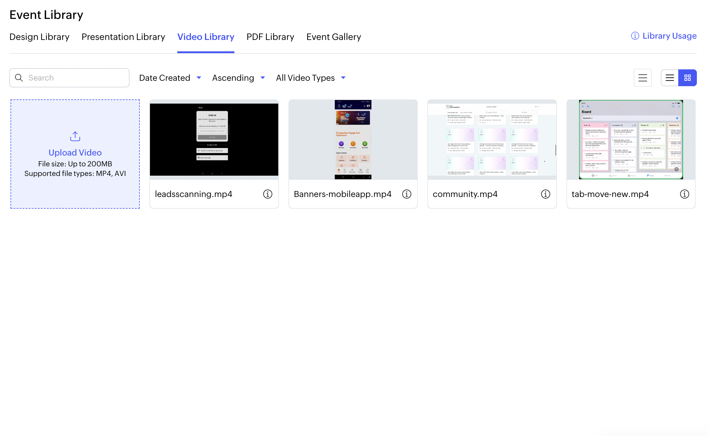 1. 移動先 管理 > Event Library > 動画 タブで、Dockからアクセスします。