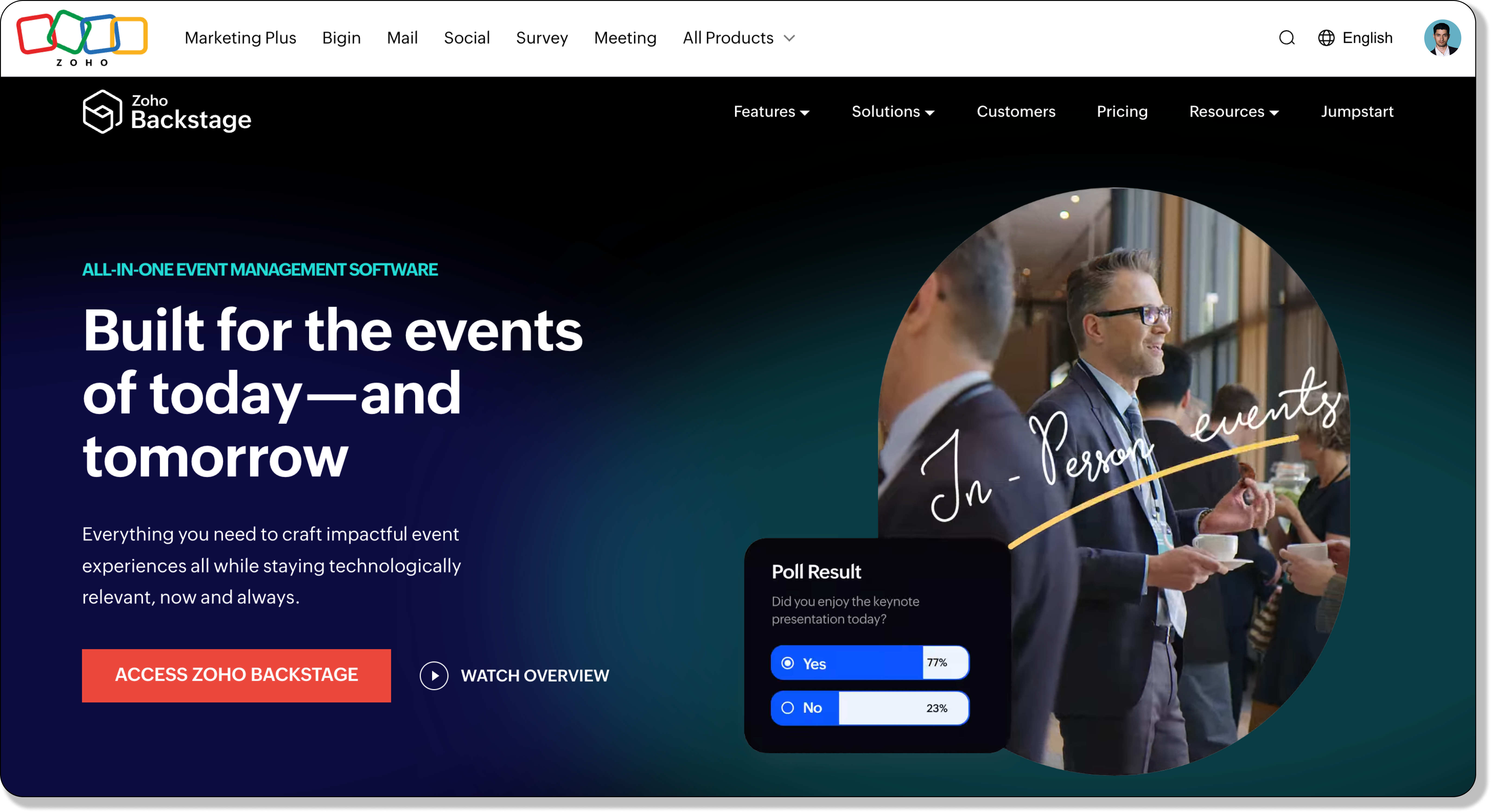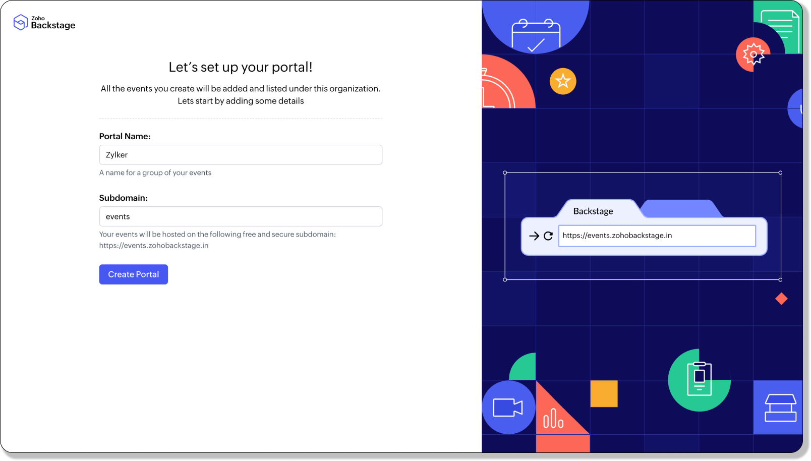 あなたのポータルが設定されたら、Zoho Backstageを通じてイベントの作成と管理を始めることができます。Webサイト作成、チケッティング、参加者エンゲージメント、その他のツールをご覧ください!